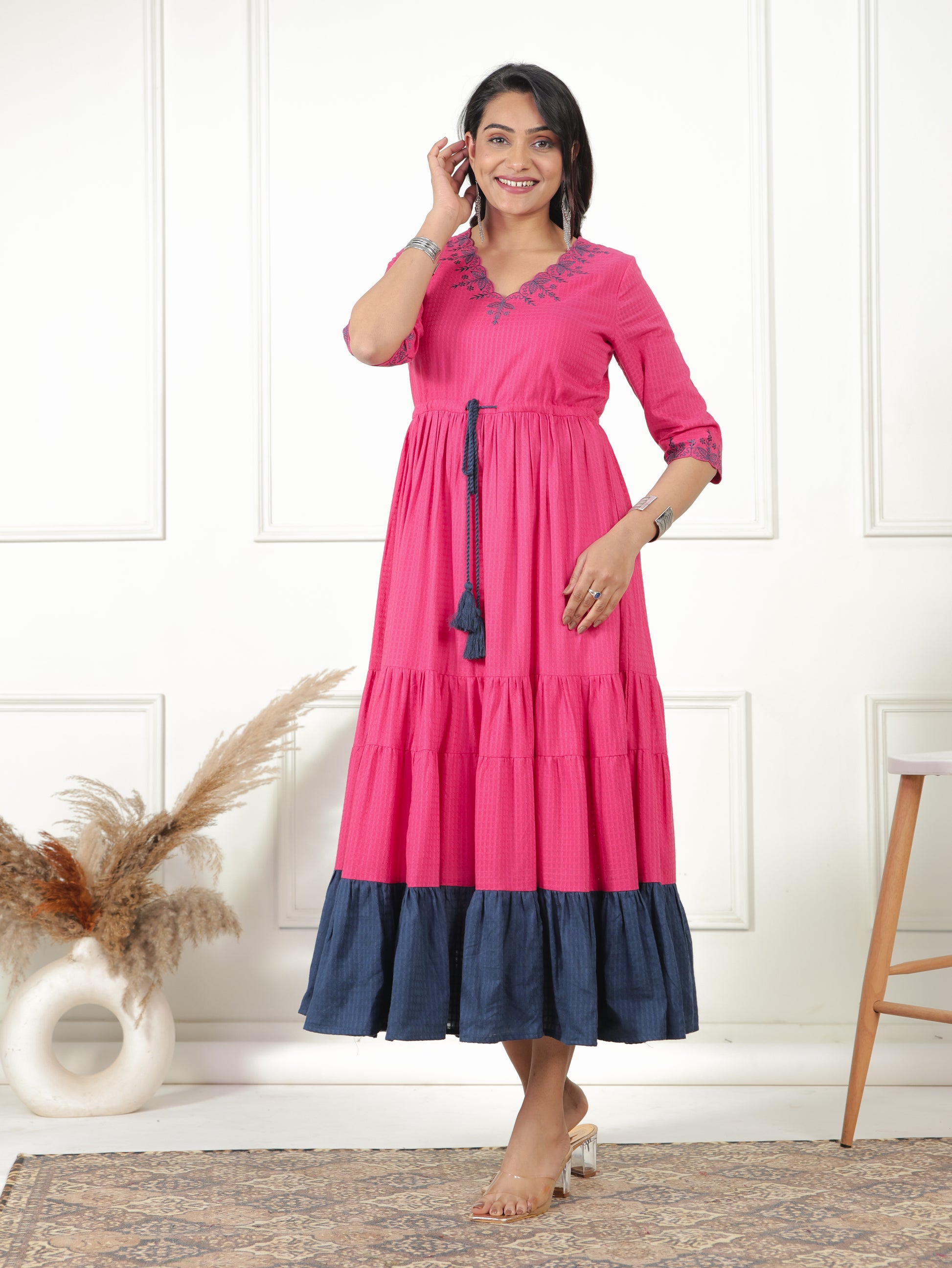 This Pink Tiered dress in Cotton Dobby is perfect for effortless daily wear. The Solid pattern and delicate work bring a modern yet artisanal touch. Lightweight and breathable, it’s ideal for warm days or casual outings. Pair with sandals or sneakers for a relaxed vibe. Easy to care for ensures hassle-free upkeep.