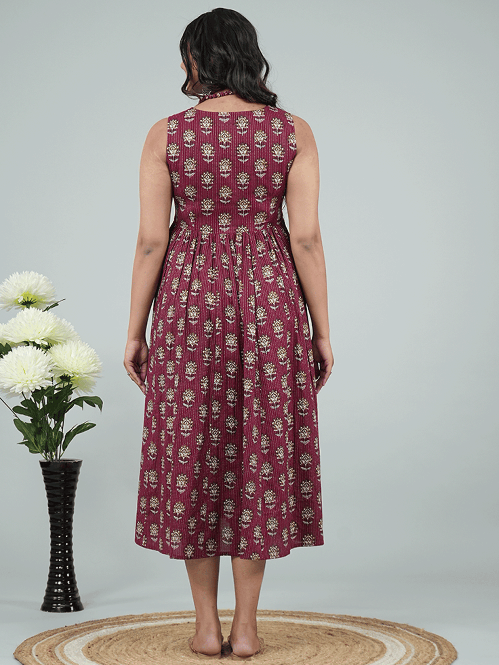Kantha Cotton Floral Gathered Purple Dress with Necklace