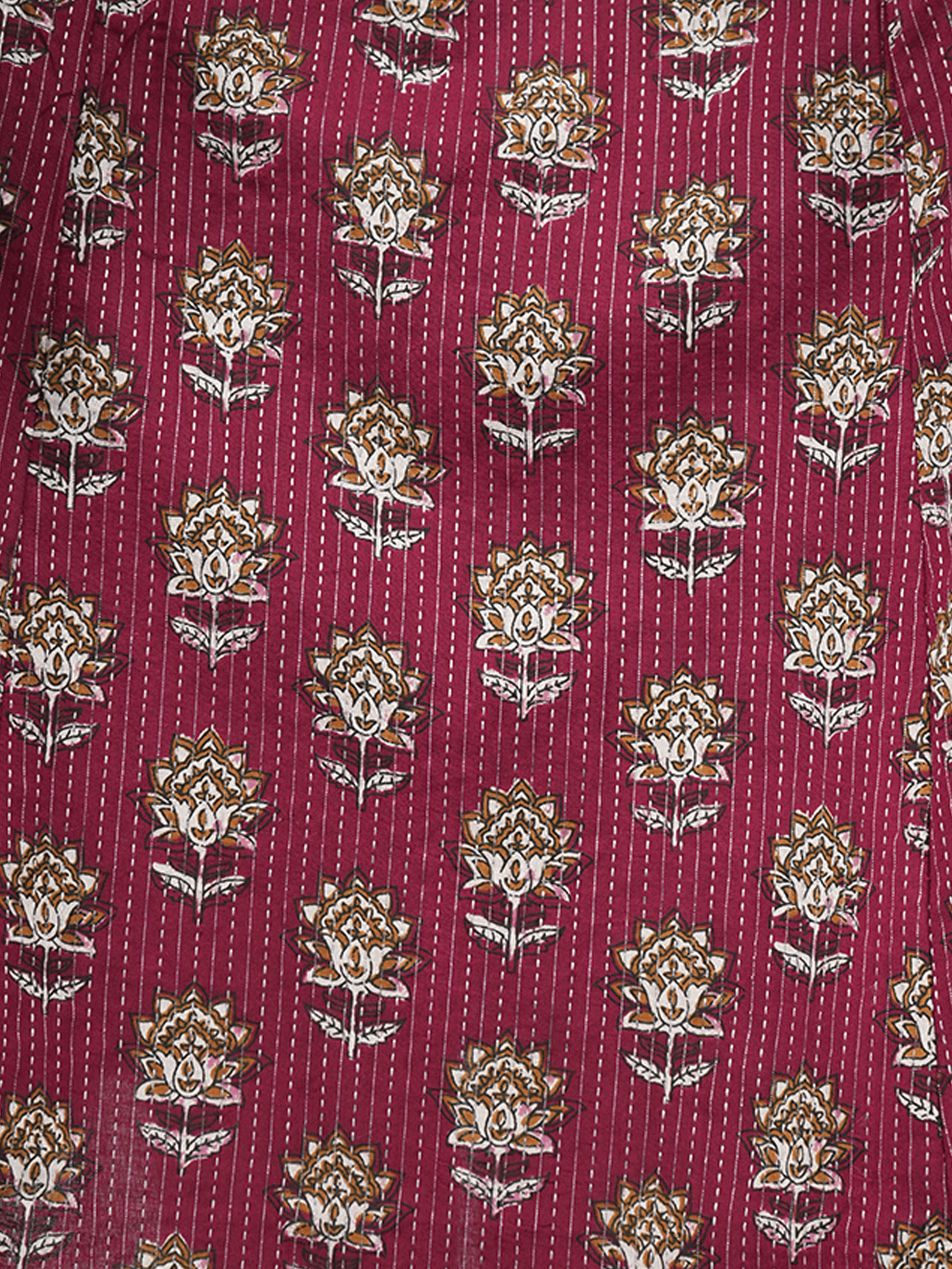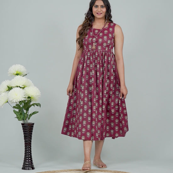This Purple dress crafted from soft Kantha Cotton is designed for comfort and versatility. The Gathered cut and Floral patterns add a playful vibe, while work accents make it unique. Perfect for holidays, shopping trips, or relaxed evenings. Style with a sling bag and chic sandals. Care is effortless with simple instructions.