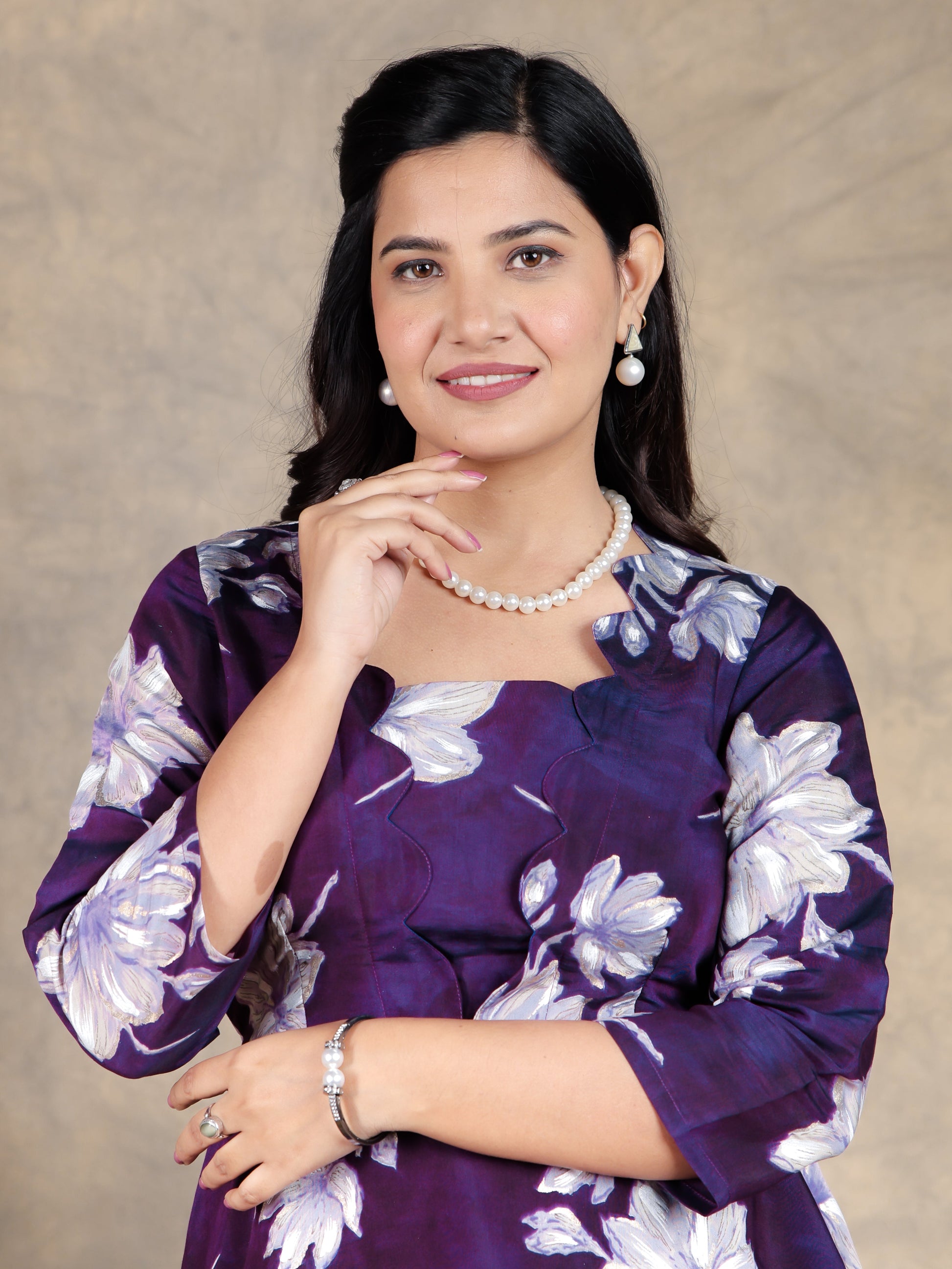 Muslin Floral Flared Purple Dress