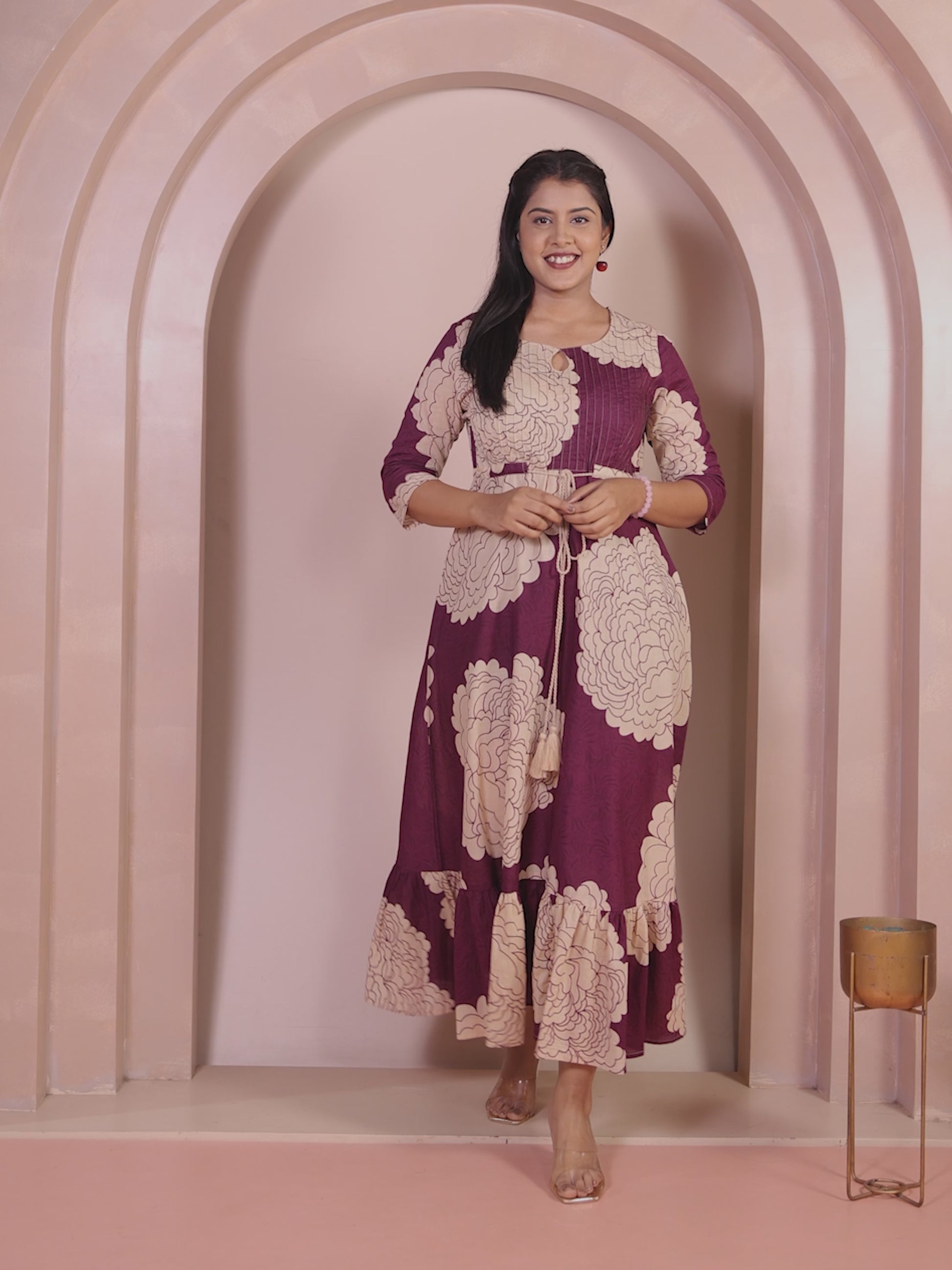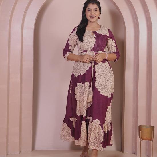 Add a touch of sophistication to your collection with this purple soft cotton floral kurta. The round neckline beautifully enhances the floral pattern. Delicate tie-up, pin tucks detailing elevates this piece to a statement wardrobe essential. The tiered design offers both comfort and style. The ankle length paired with 3/4 sleeve creates a proportioned silhouette. Suitable for daily wear or casual outings, and easily maintained with machine wash.