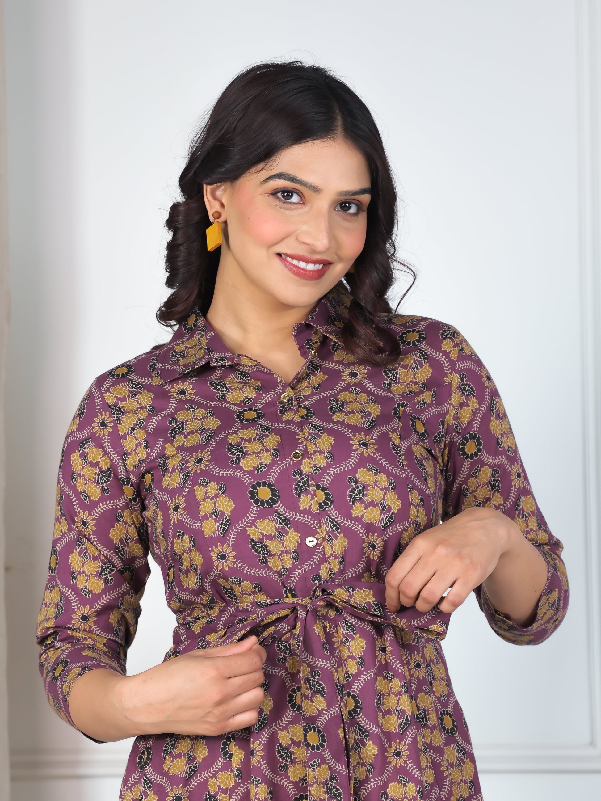 This Purple dress crafted from soft Soft Cotton is designed for comfort and versatility. The High Low cut and Geometric patterns add a playful vibe, while work accents make it unique. Perfect for holidays, shopping trips, or relaxed evenings. Style with a sling bag and chic sandals. Care is effortless with simple instructions.