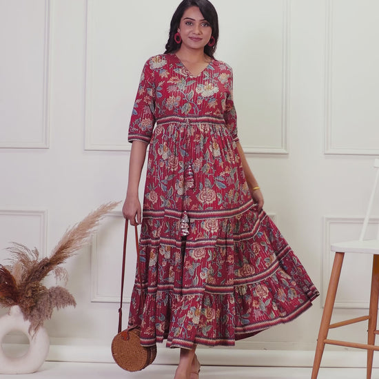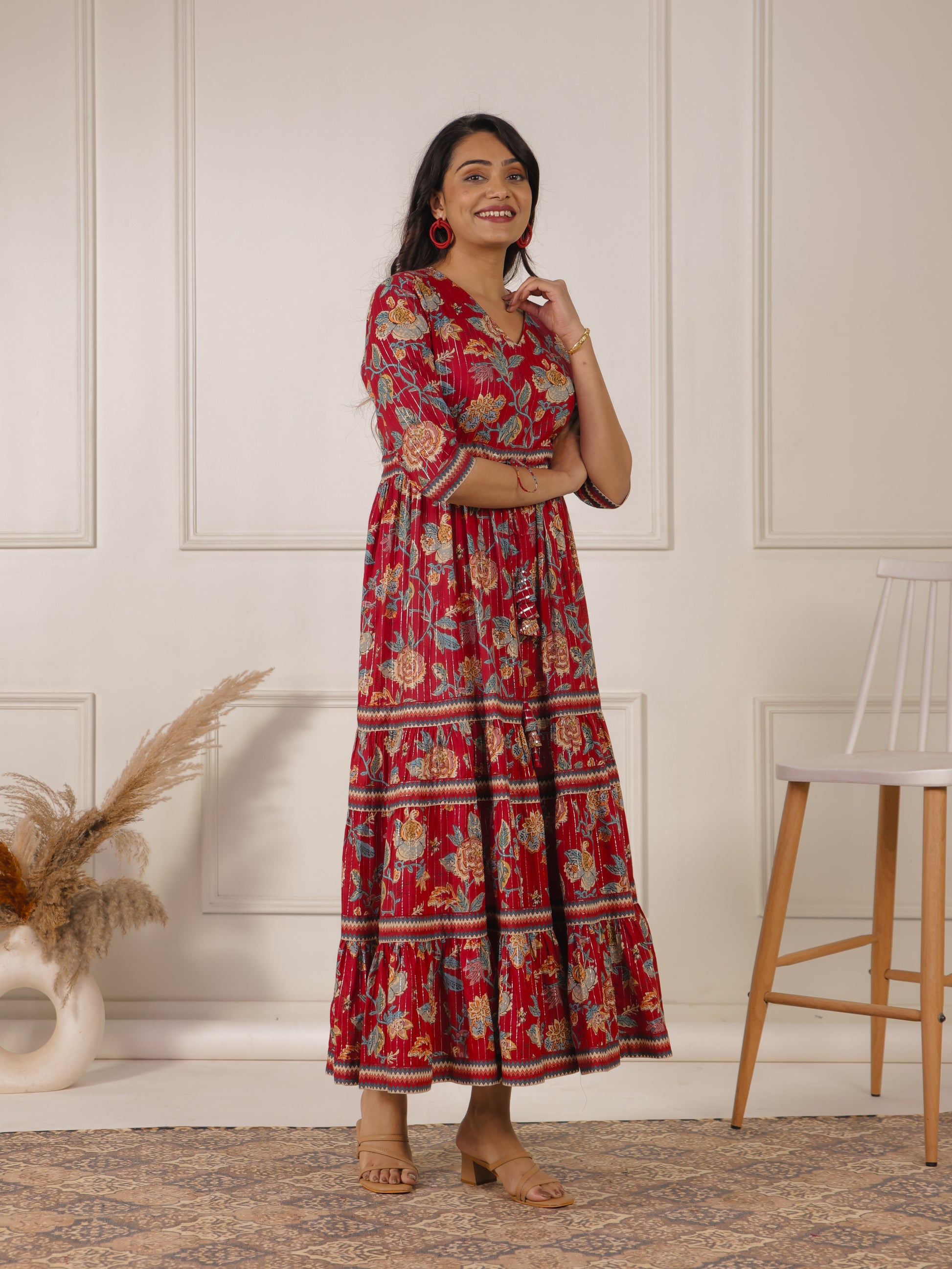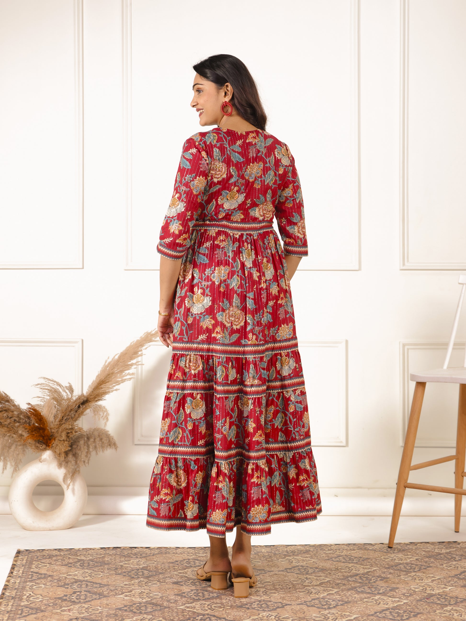 Add a stylish staple to your wardrobe with this A-line dress in Red. The breathable Lurex Cotton fabric keeps you comfortable all day, while the Floral motifs and subtle work elements create a sophisticated charm. Dress it up with heels or keep it casual with flats.
