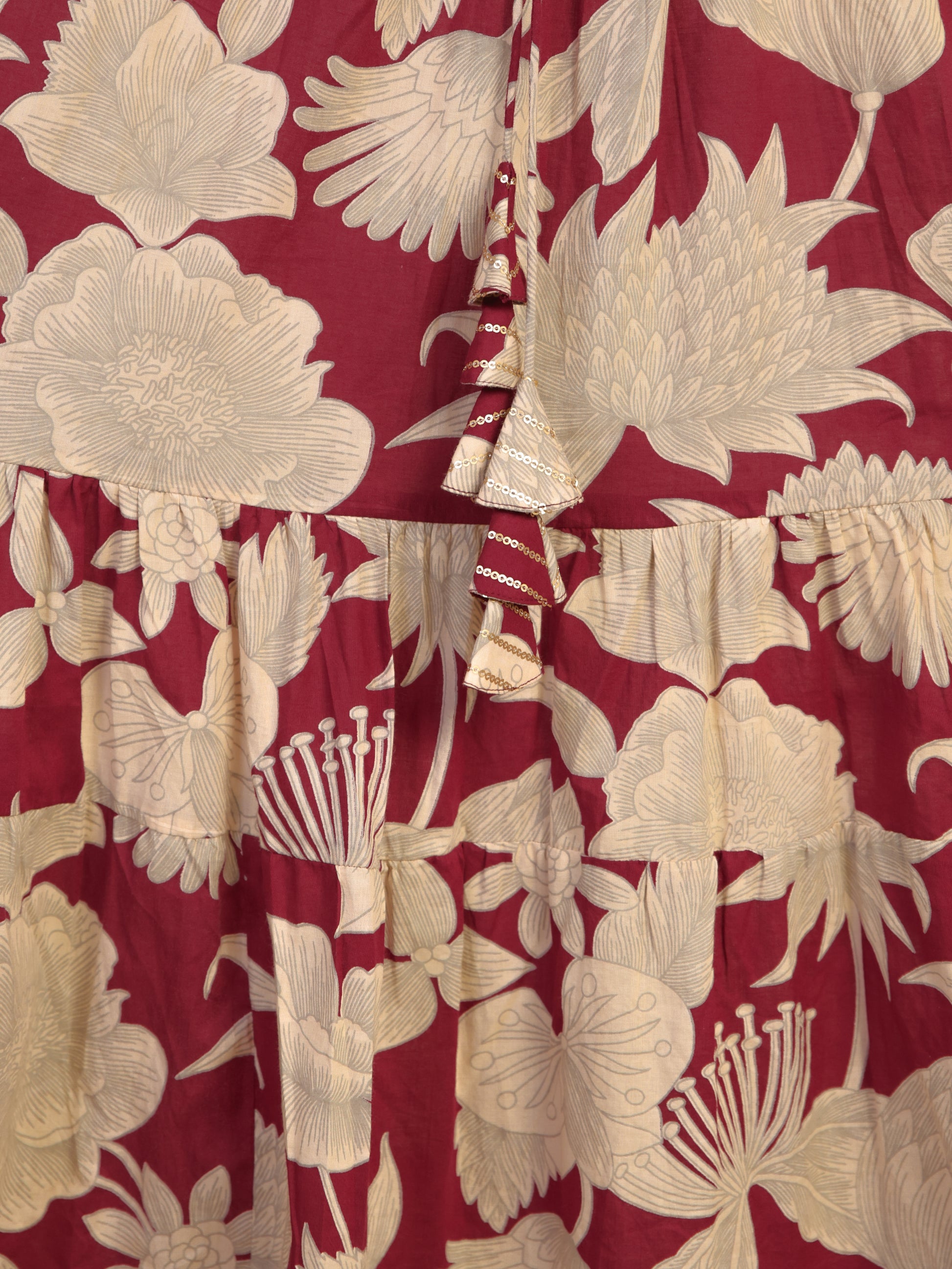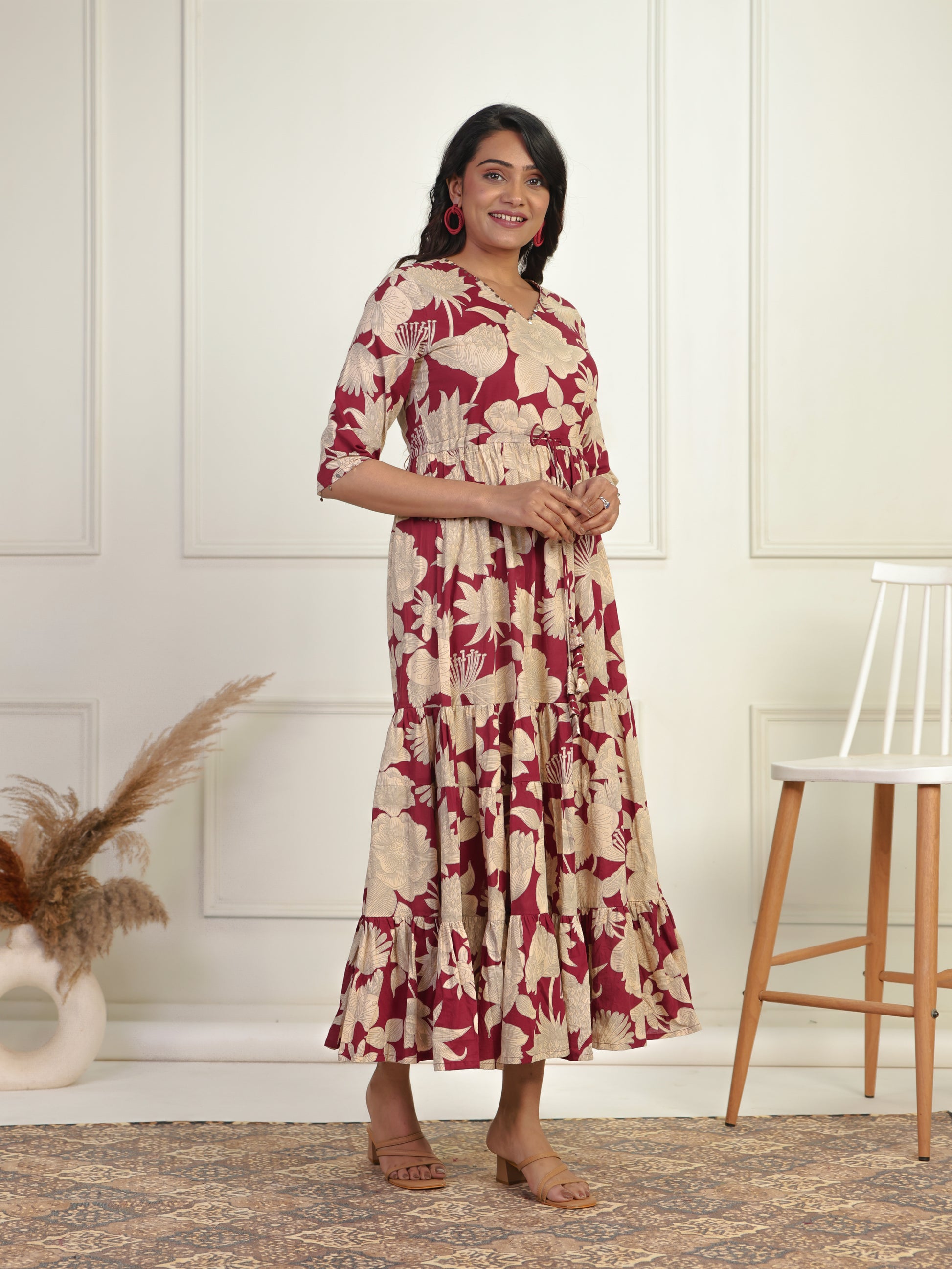 Embroidered Soft Cotton Floral Tiered Maroon Dress