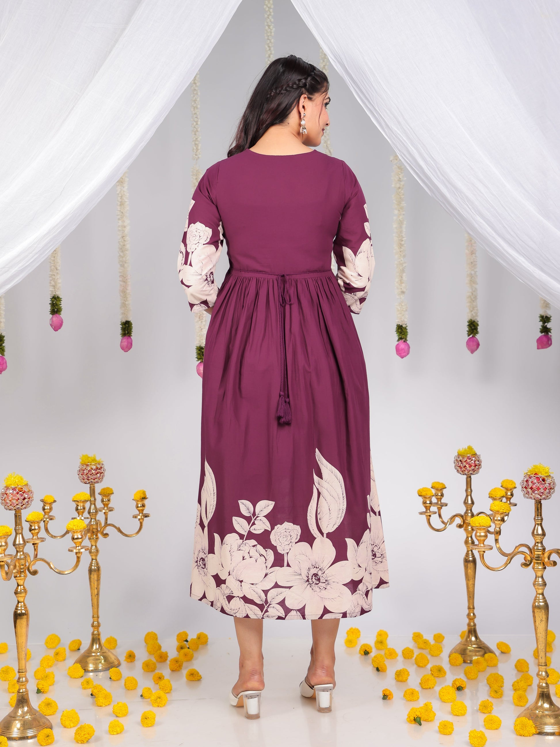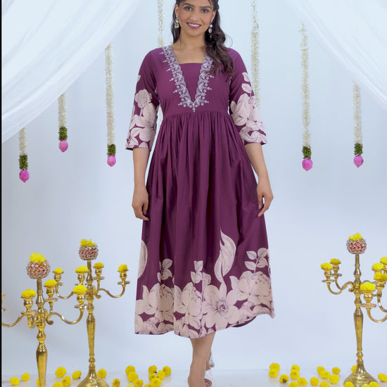 Embroidered Soft Cotton Placement Print Flared Wine Dress