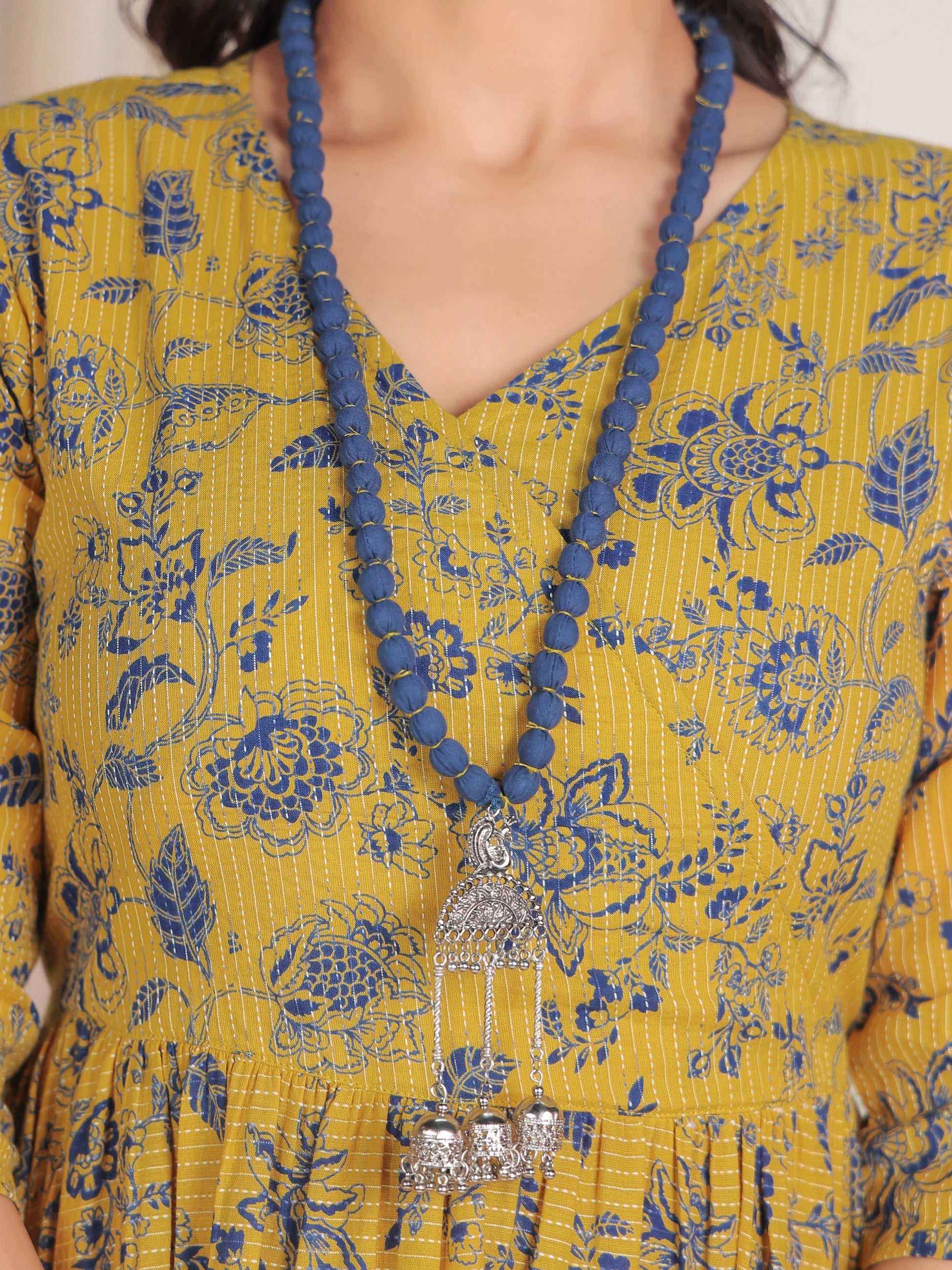 Kantha Cotton Floral Angrakha Yellow Dress with Necklace