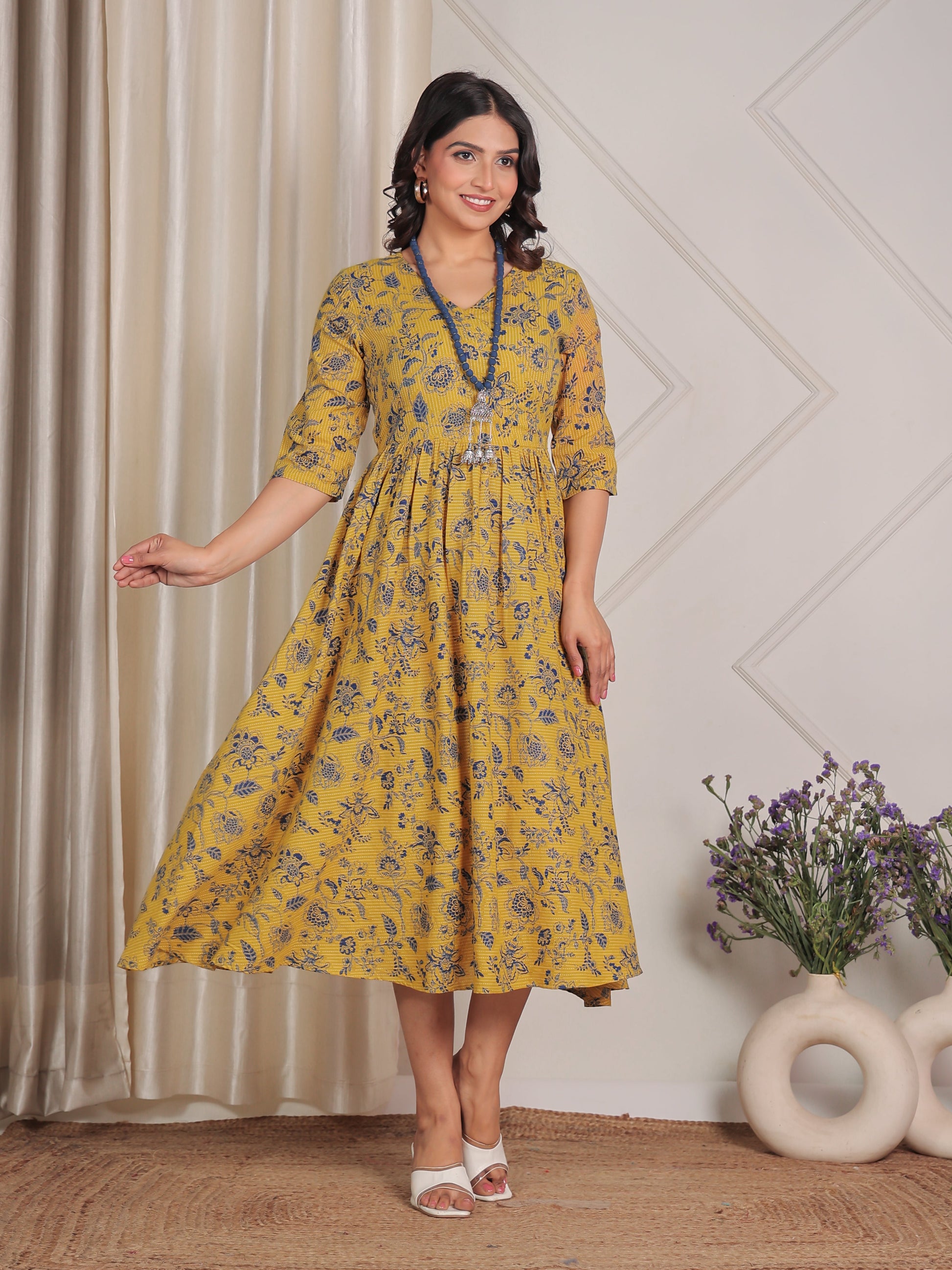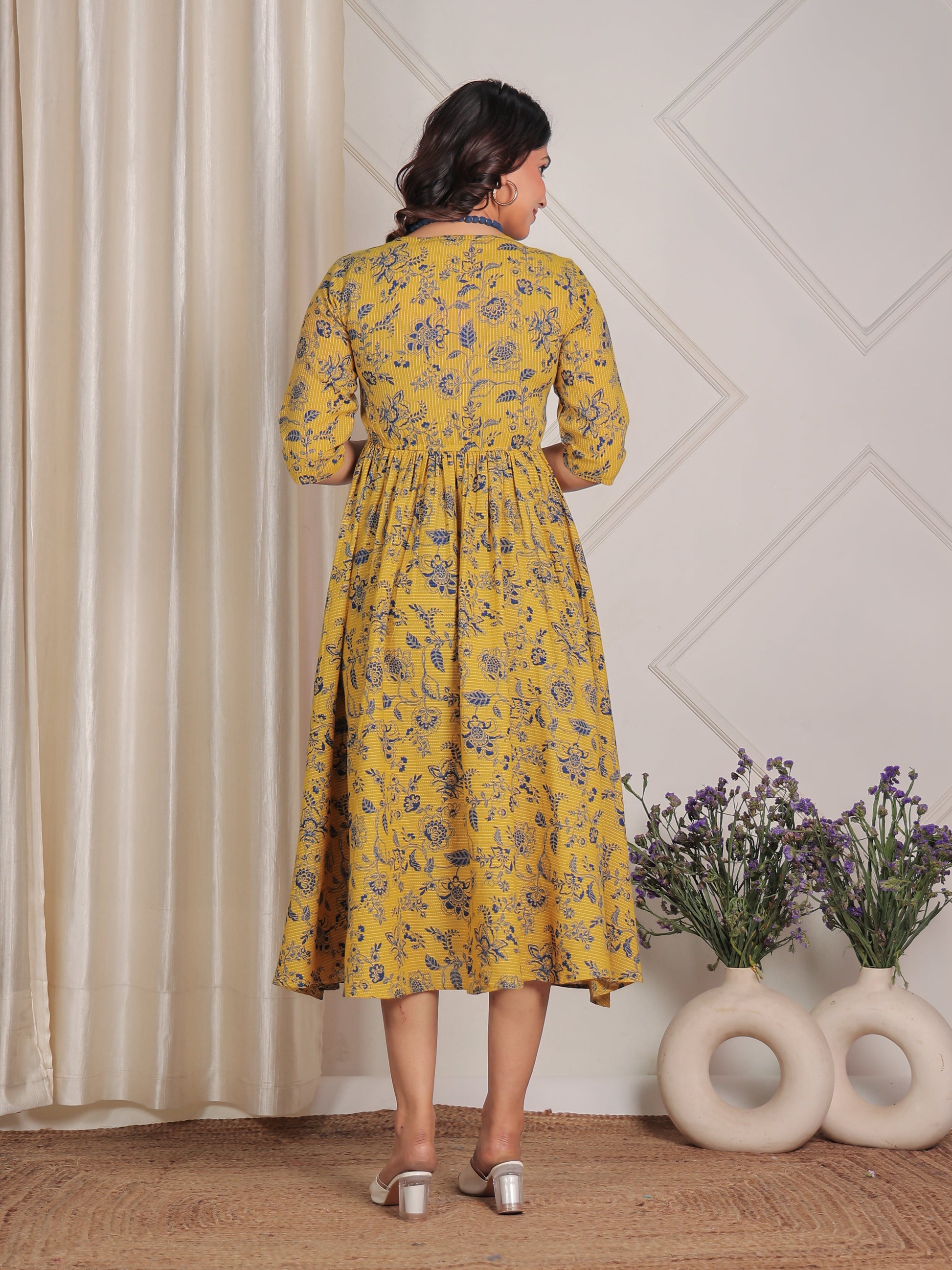 This Yellow dress crafted from soft Kantha Cotton is designed for comfort and versatility. The Angrakha cut and Floral patterns add a playful vibe, while work accents make it unique. Perfect for holidays, shopping trips, or relaxed evenings. Style with a sling bag and chic sandals. Care is effortless with simple instructions.