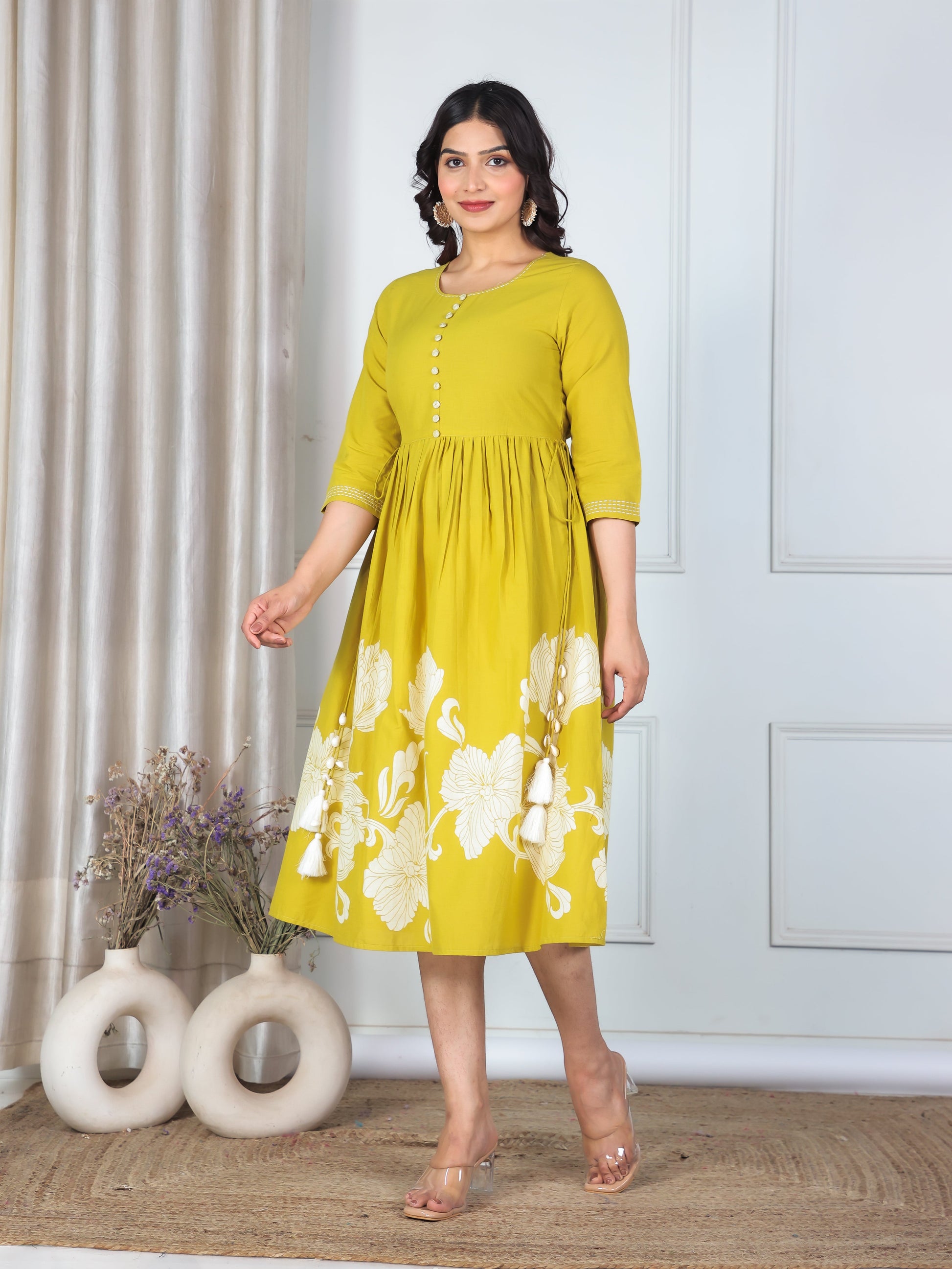 Embroidered Soft Cotton Placement Print A-line Yellow Dress