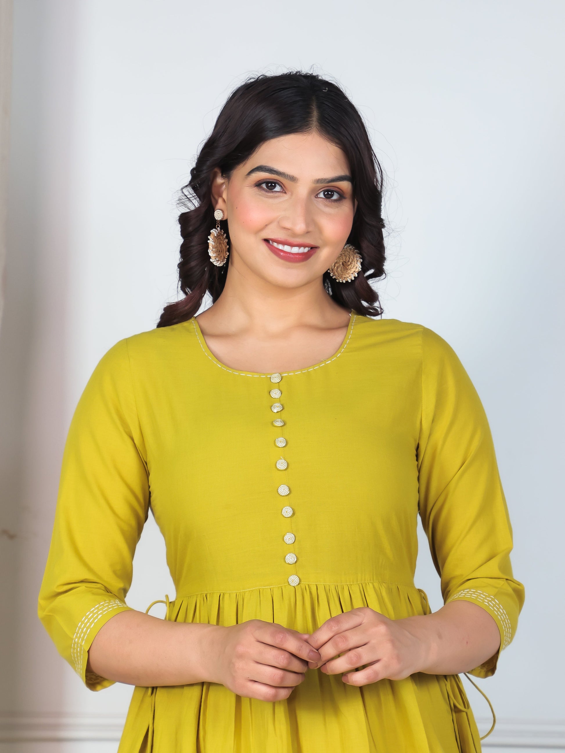 Designed for comfort and confidence, this Soft Cotton dress in Yellow features a flattering A-line silhouette and unique Placement Print accents. The work detailing adds sophistication, making it perfect for coffee dates, casual evenings, or weekend brunches. Accessorise with minimal jewellery and flats for a polished finish.