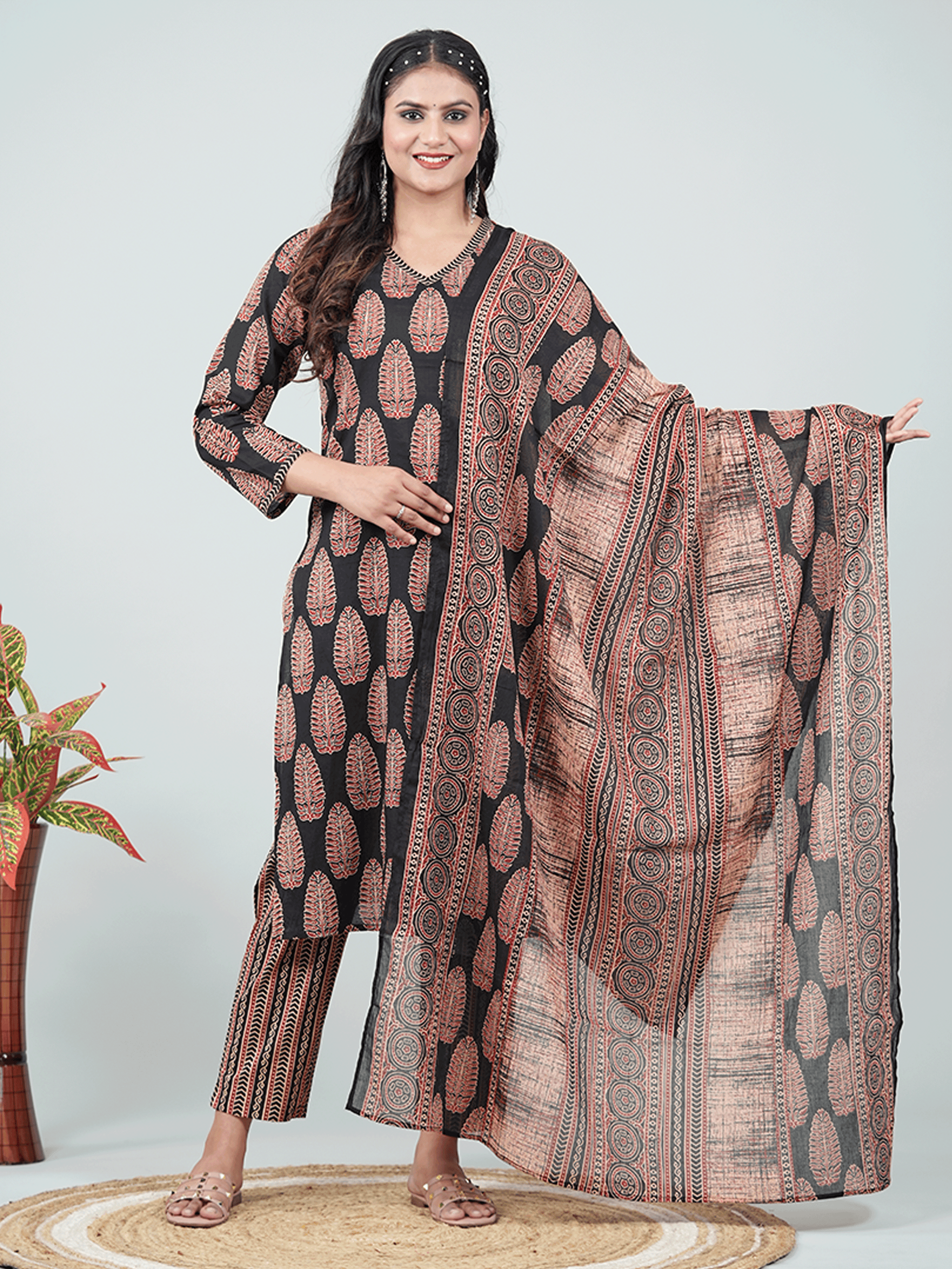 This Cotton Voile dupatta in Black brings a festive touch to any outfit. The intricate Ajrakh patterns showcase artisanal craftsmanship, making it ideal for celebrations, weddings, or cultural events. Its soft, flowy design ensures comfort and an elegant drape. Style it with matching accessories for a sophisticated ethnic ensemble that stands out with timeless charm.