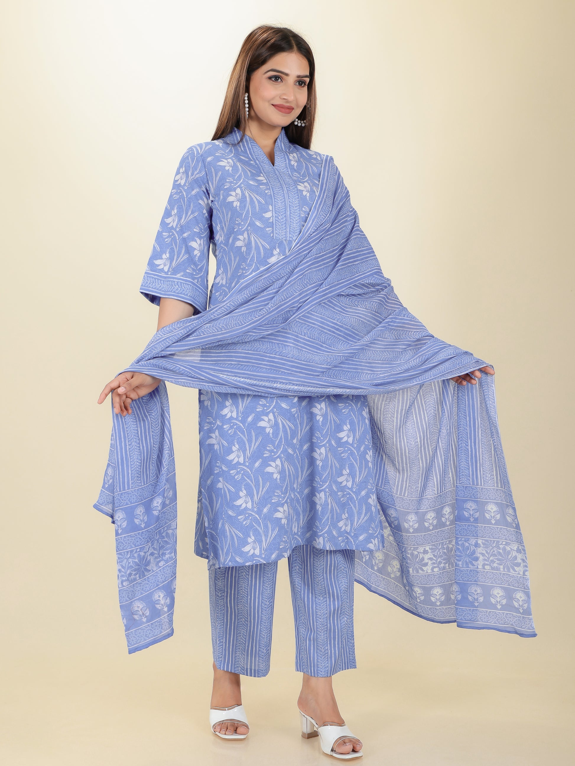 This Voile Cotton dupatta in Blue is a versatile accessory for any wardrobe. Designed with a subtle Striped motif, it adds sophistication to both casual and festive outfits. Its soft, flowy texture ensures comfort, while the vibrant colour brightens any ensemble. Wrap it around your shoulders or drape elegantly for a timeless ethnic appeal.
