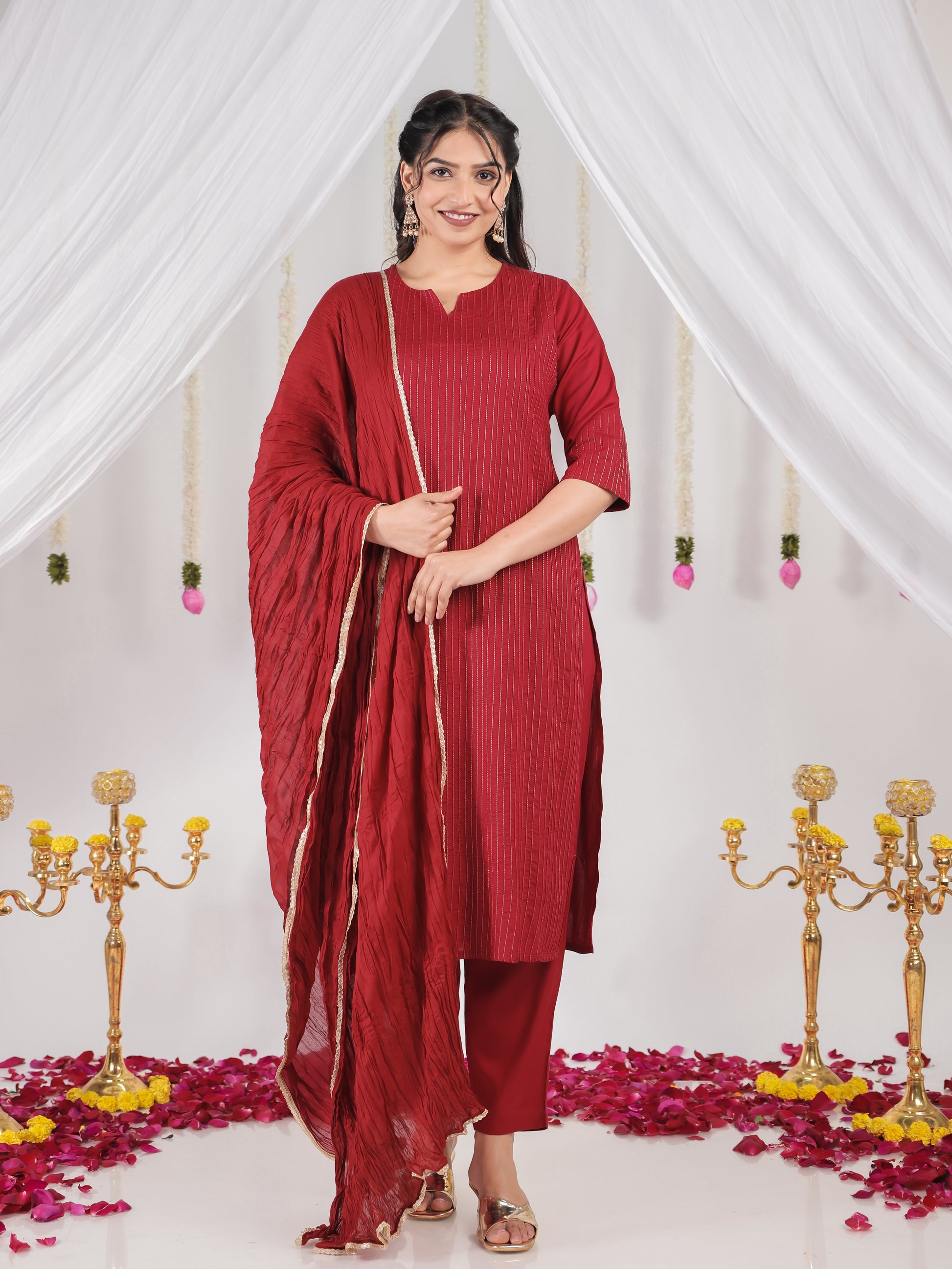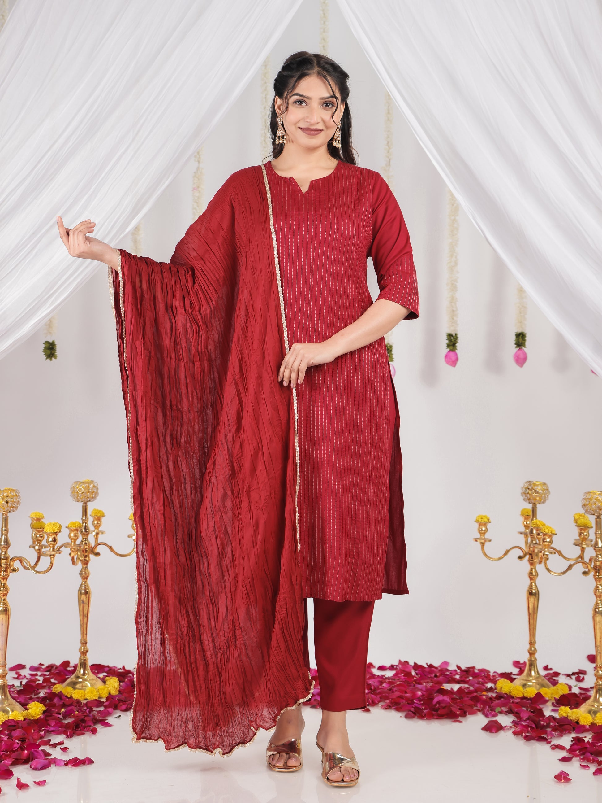 This Cotton Voile dupatta in Maroon brings a festive touch to any outfit. The intricate Solid patterns showcase artisanal craftsmanship, making it ideal for celebrations, weddings, or cultural events. Its soft, flowy design ensures comfort and an elegant drape. Style it with matching accessories for a sophisticated ethnic ensemble that stands out with timeless charm.