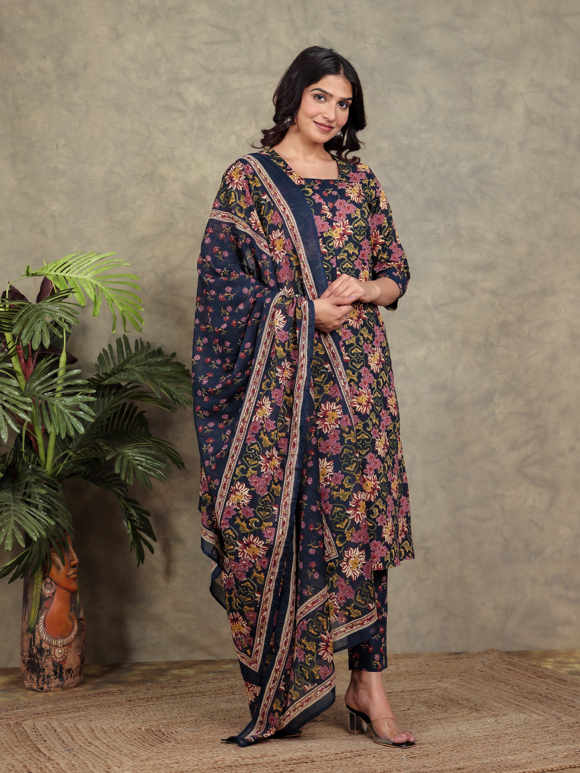 Elevate your ethnic look with this Navy Blue dupatta crafted from lightweight Cotton Voile. The intricate Floral design adds a traditional charm, making it perfect for festive occasions or everyday elegance. Pair it with kurtas, suits, or dresses for a polished touch. Its breathable fabric ensures all-day comfort while maintaining a graceful drape for effortless styling.