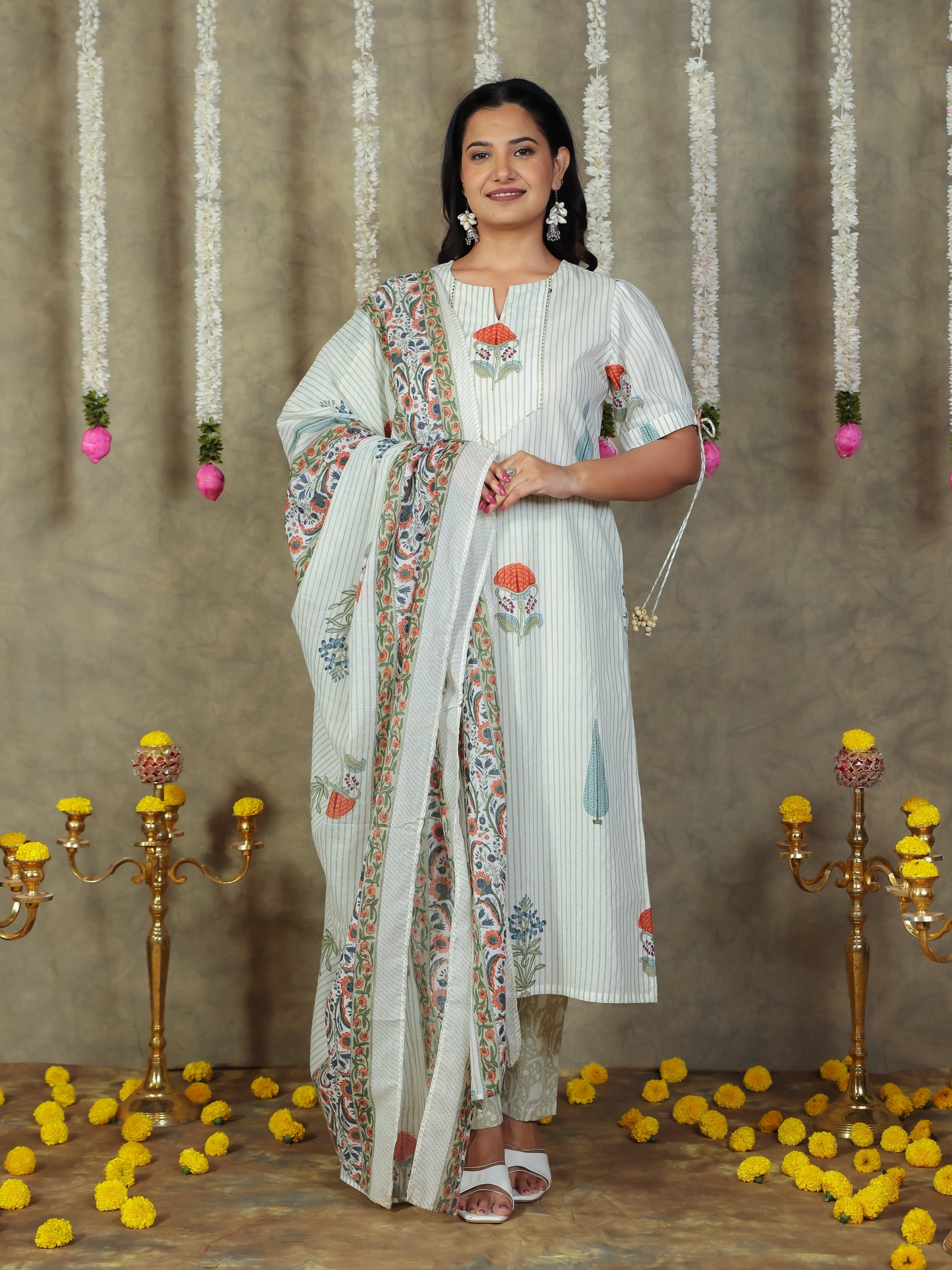 This Cotton Voile dupatta in Off White is a versatile accessory for any wardrobe. Designed with a subtle Floral motif, it adds sophistication to both casual and festive outfits. Its soft, flowy texture ensures comfort, while the vibrant colour brightens any ensemble. Wrap it around your shoulders or drape elegantly for a timeless ethnic appeal.