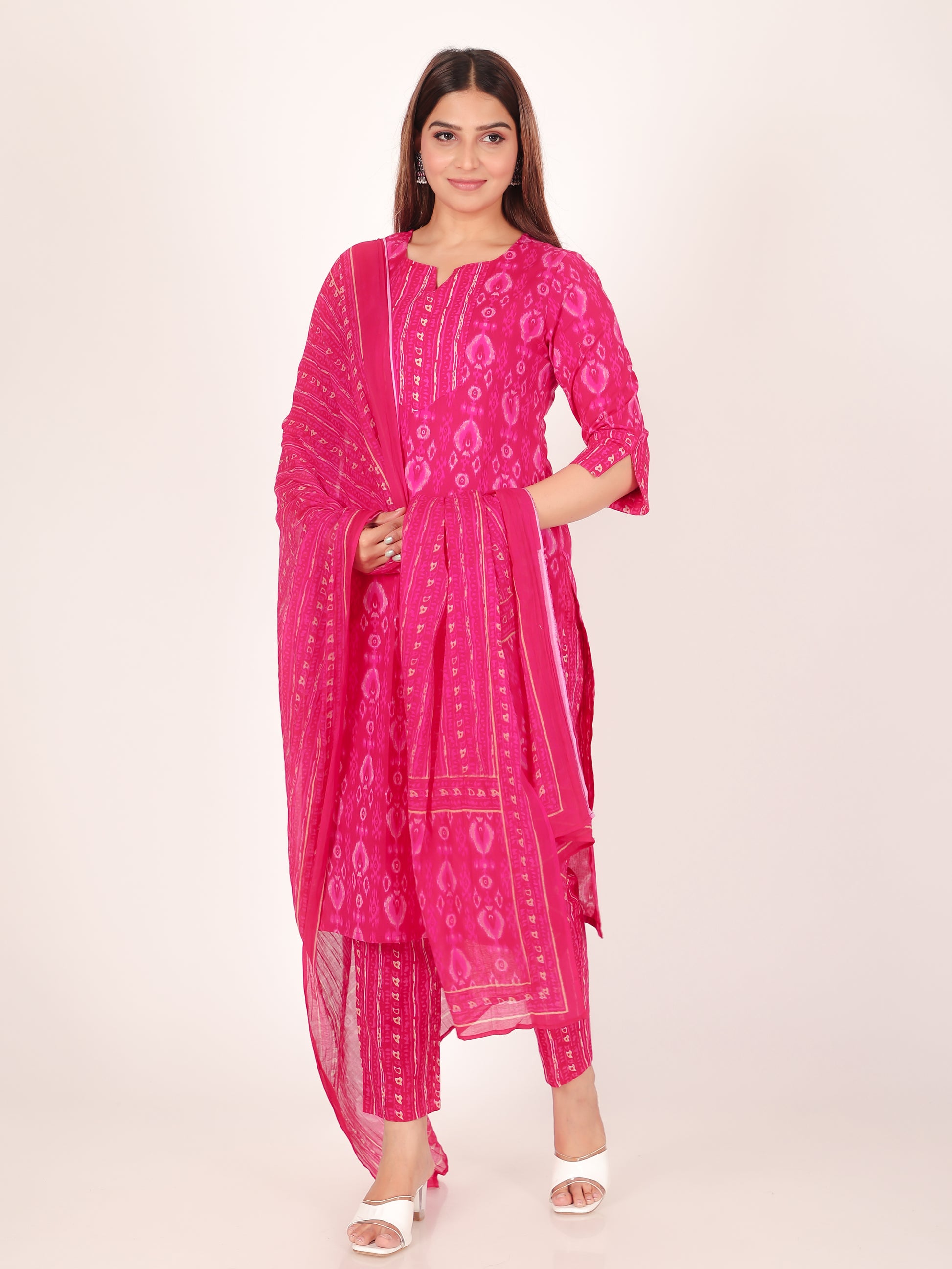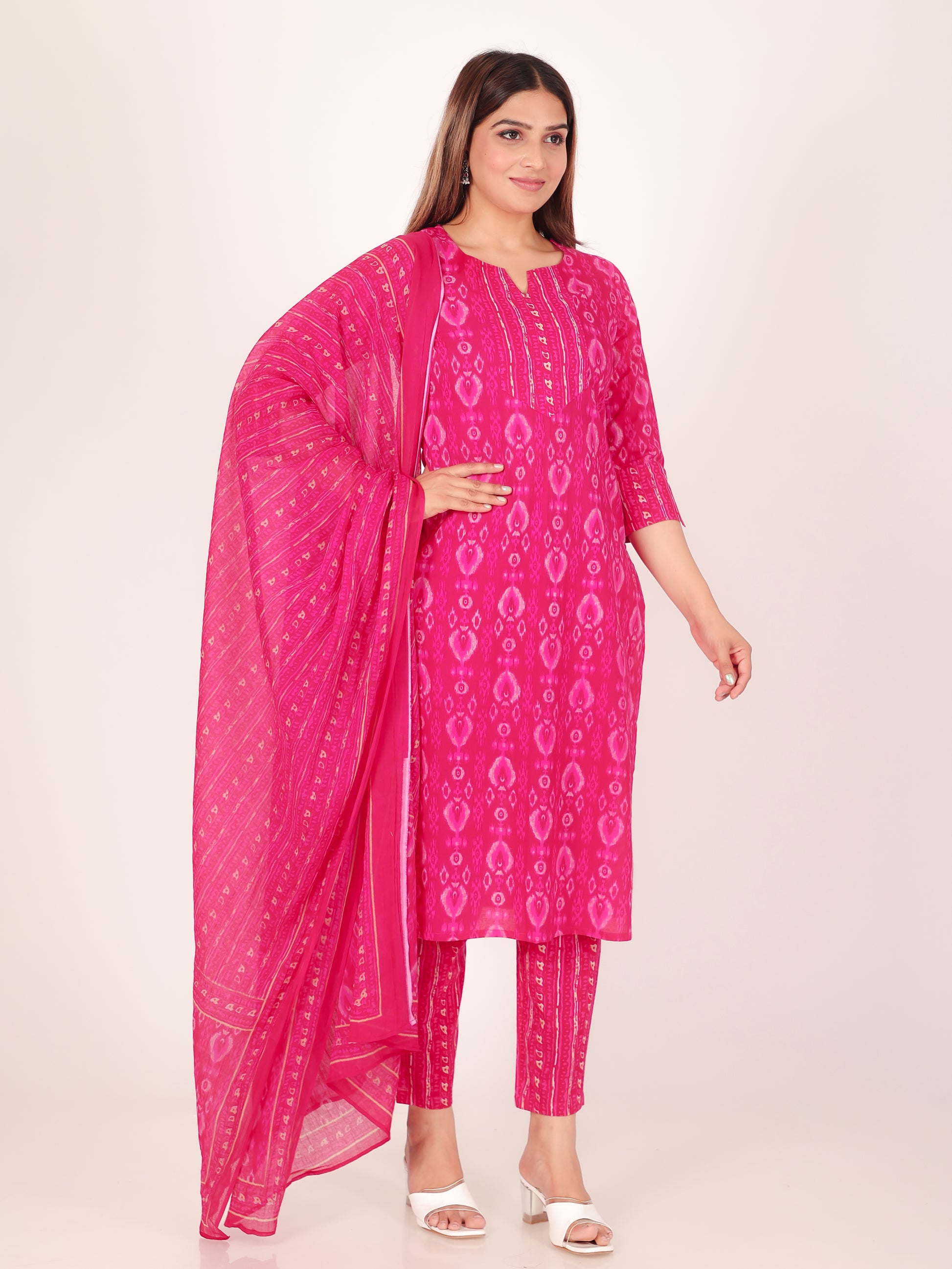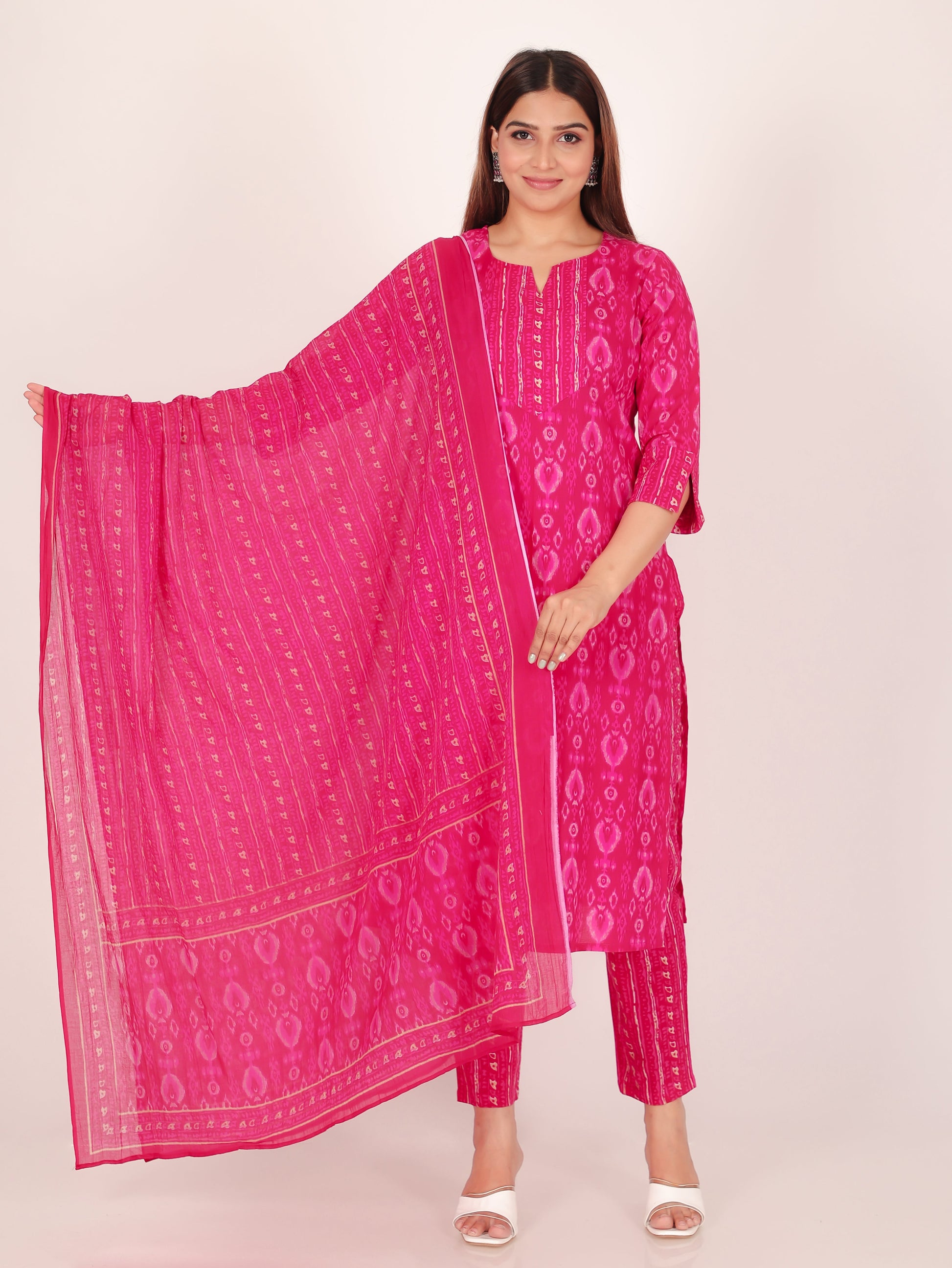 Add a pop of style to your collection with this Pink dupatta made of breathable Voile Cotton. The Ikat detailing offers a blend of traditional and modern flair, making it perfect for workwear, daily styling, or small gatherings. Lightweight and easy to carry, it pairs beautifully with kurtas and tunics, ensuring effortless grace every day.