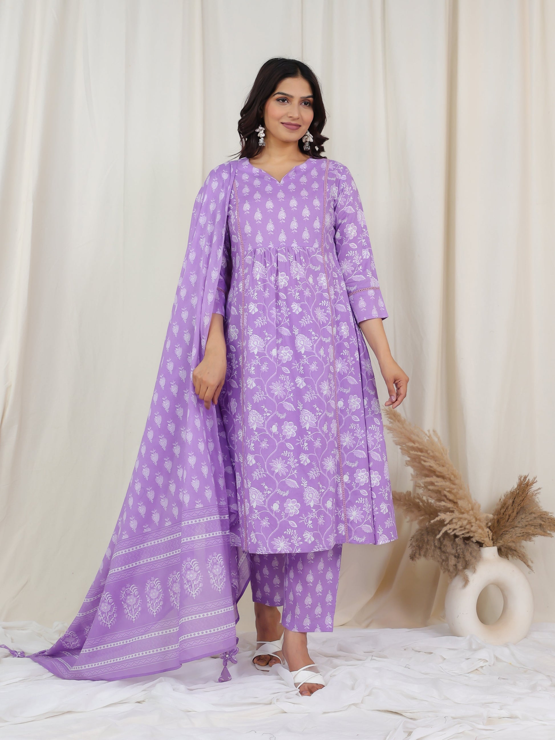 This Cotton Voile dupatta in Purple brings a festive touch to any outfit. The intricate Floral patterns showcase artisanal craftsmanship, making it ideal for celebrations, weddings, or cultural events. Its soft, flowy design ensures comfort and an elegant drape. Style it with matching accessories for a sophisticated ethnic ensemble that stands out with timeless charm.
