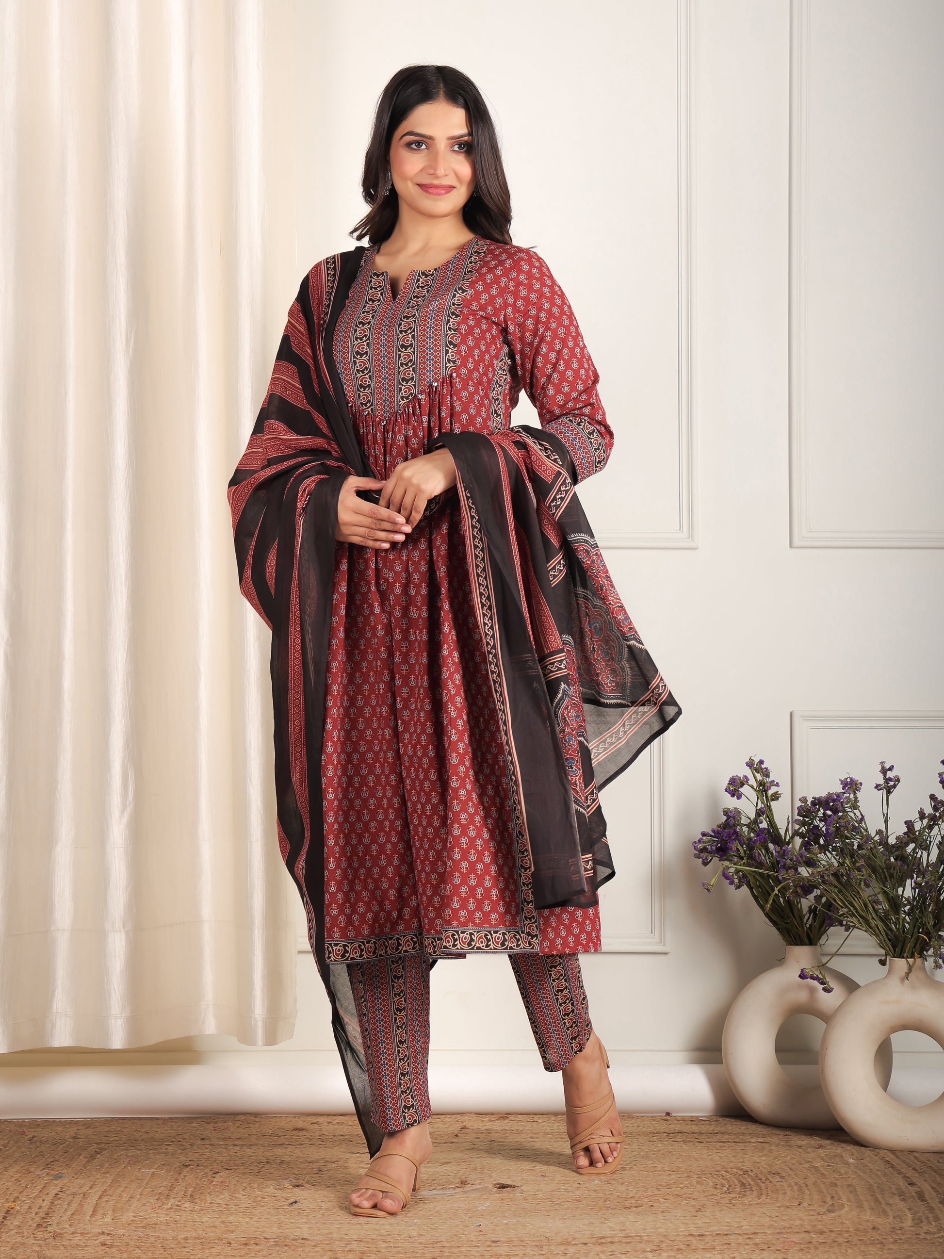 This Cotton Voile dupatta in Red is a versatile accessory for any wardrobe. Designed with a subtle Ajrakh motif, it adds sophistication to both casual and festive outfits. Its soft, flowy texture ensures comfort, while the vibrant colour brightens any ensemble. Wrap it around your shoulders or drape elegantly for a timeless ethnic appeal.