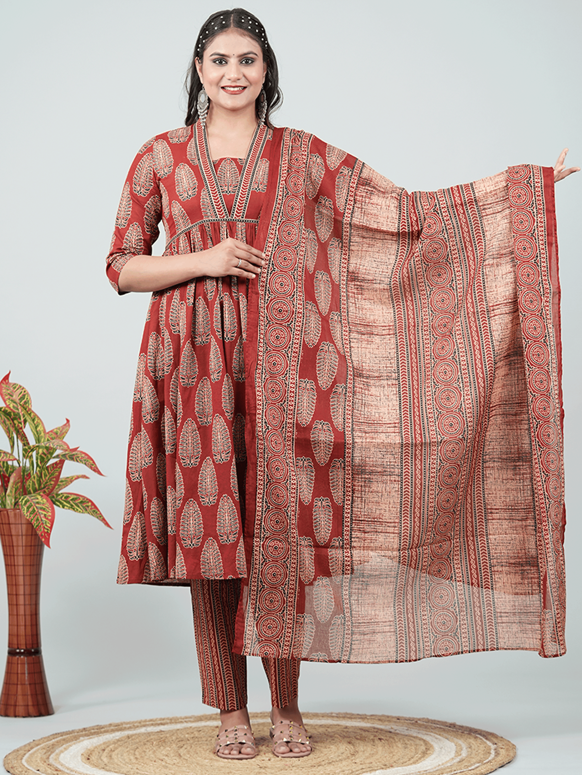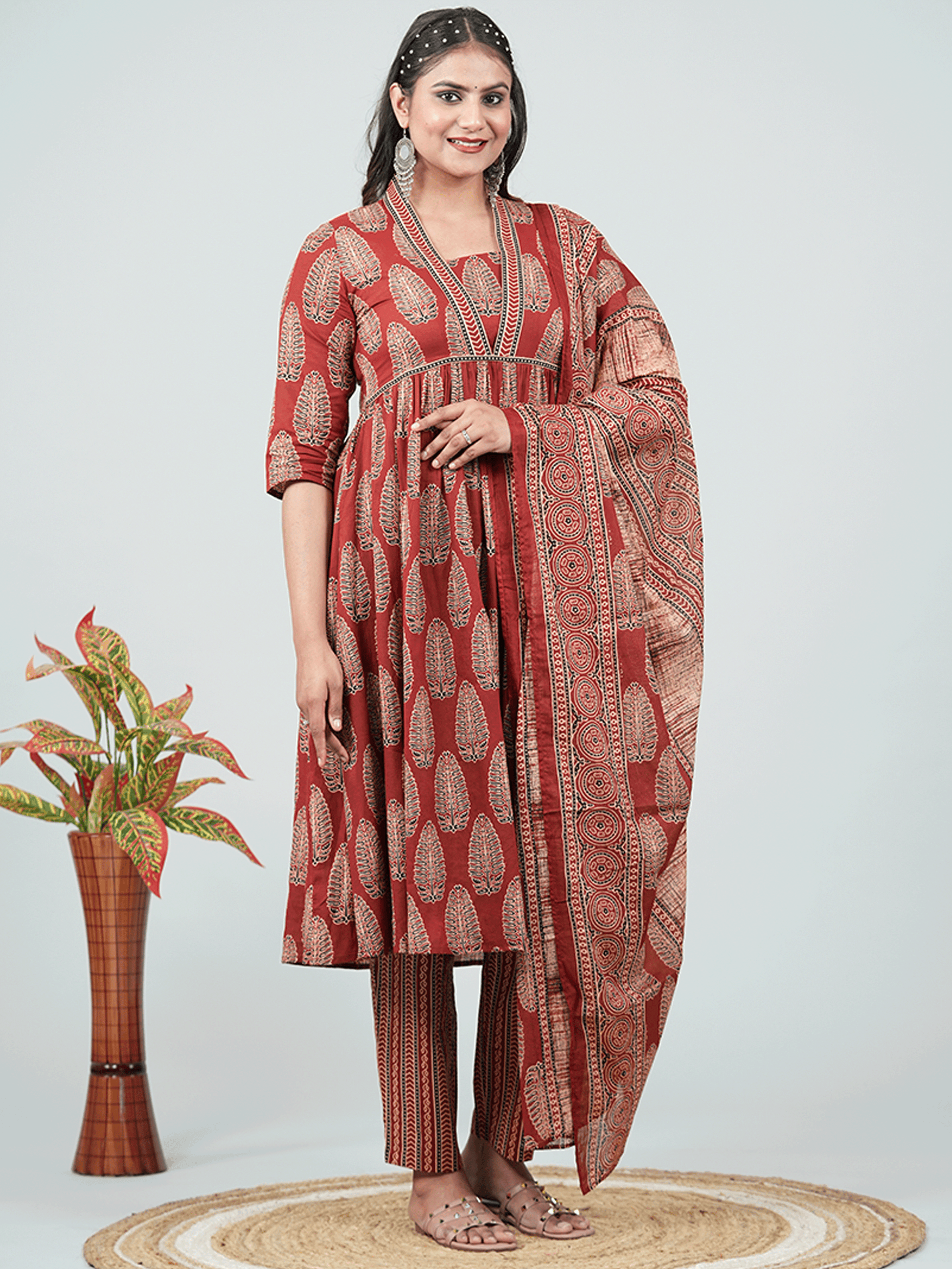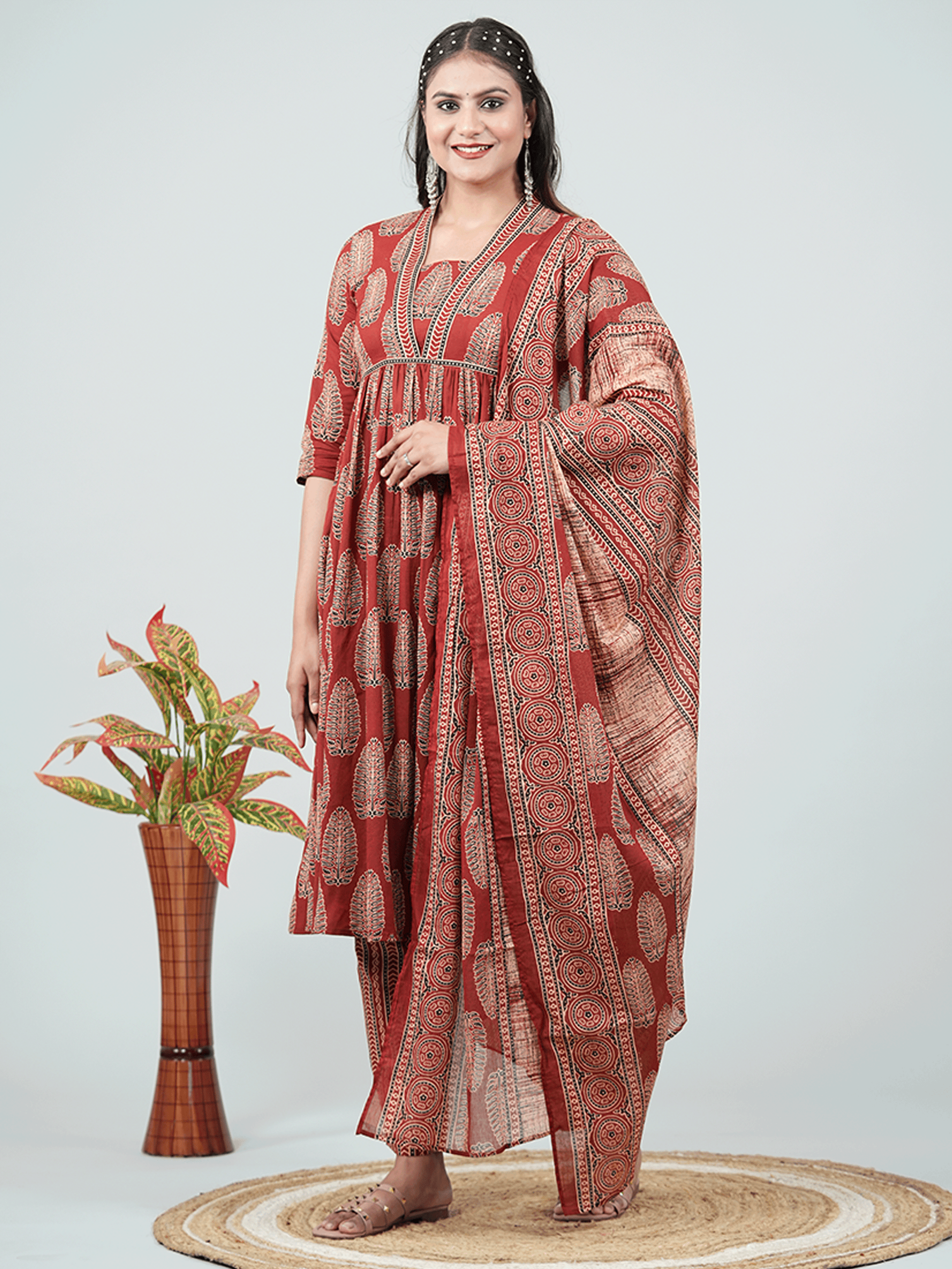 Add a pop of style to your collection with this Red dupatta made of breathable Cotton Voile. The Ajrakh detailing offers a blend of traditional and modern flair, making it perfect for workwear, daily styling, or small gatherings. Lightweight and easy to carry, it pairs beautifully with kurtas and tunics, ensuring effortless grace every day.