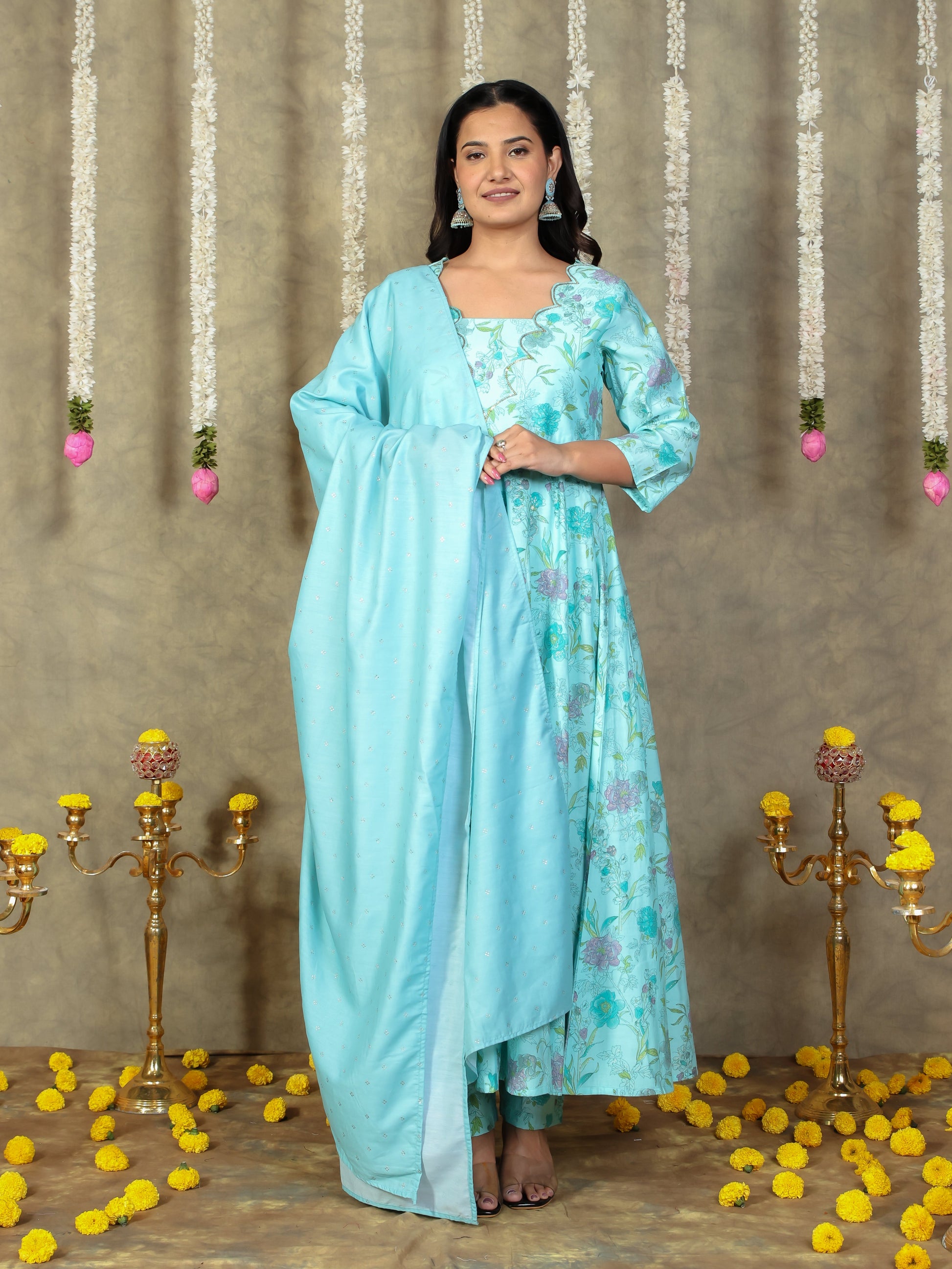 Muslin Floral Turquoise Dupatta