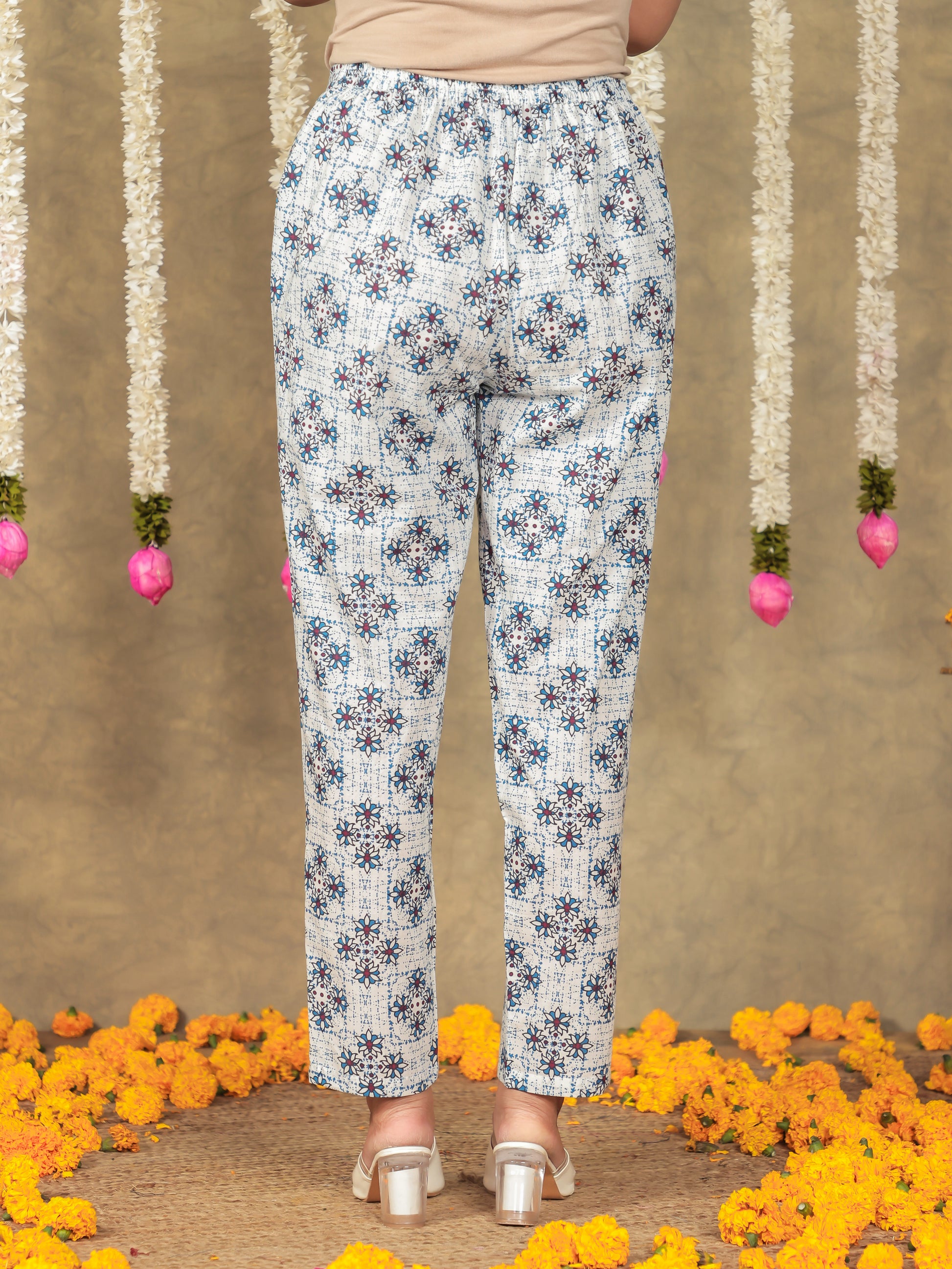 Upgrade your wardrobe with these White bottoms made from lightweight Soft Cotton. The Geometric accents bring subtle charm, while pockets make them practical for all-day wear. Perfect for pairing with ethnic kurtas or western blouses, these bottoms are a go-to choice for comfort and style. Easy care ensures they stay fresh season after season.