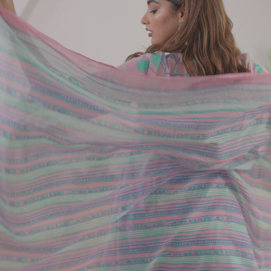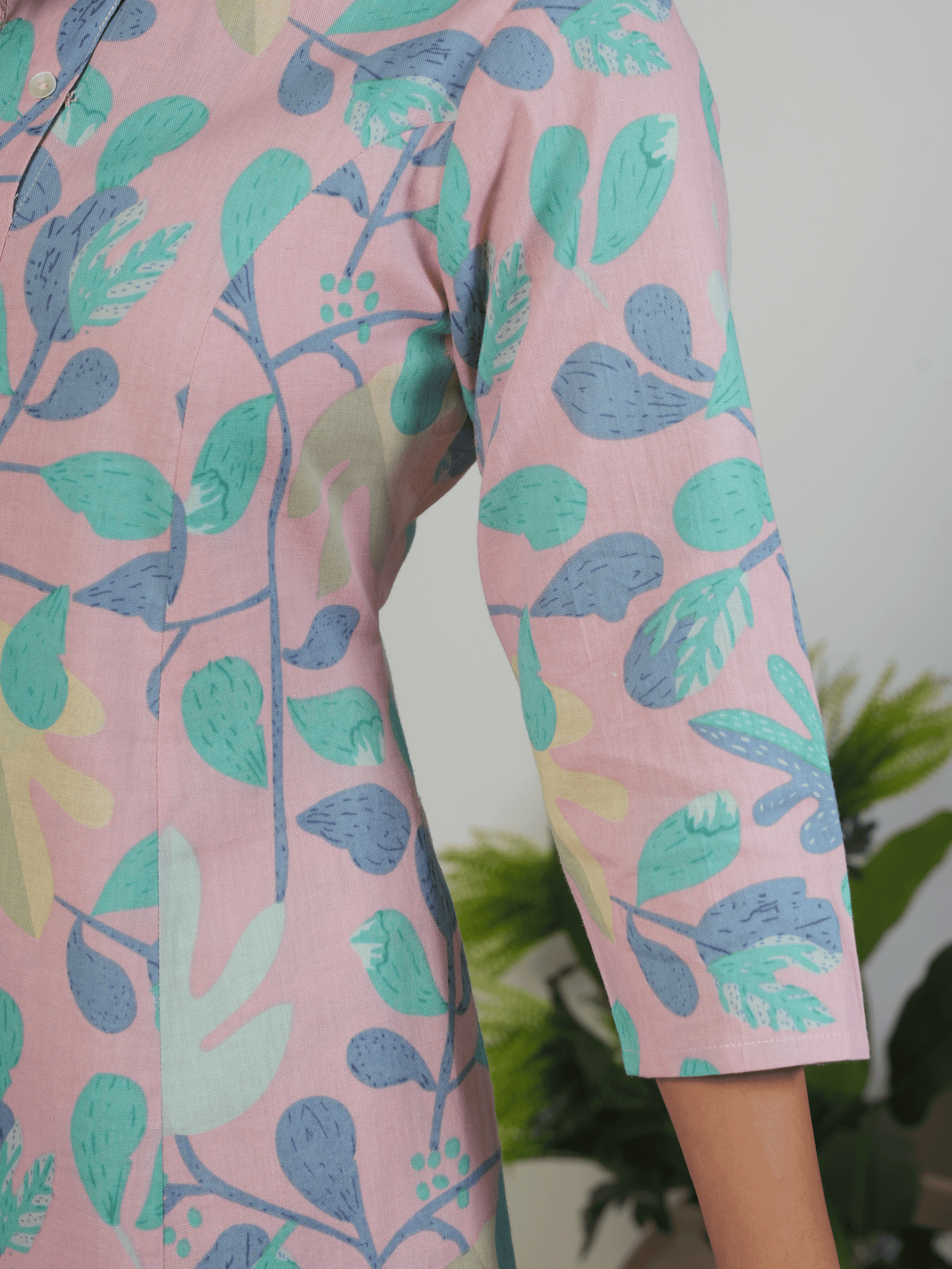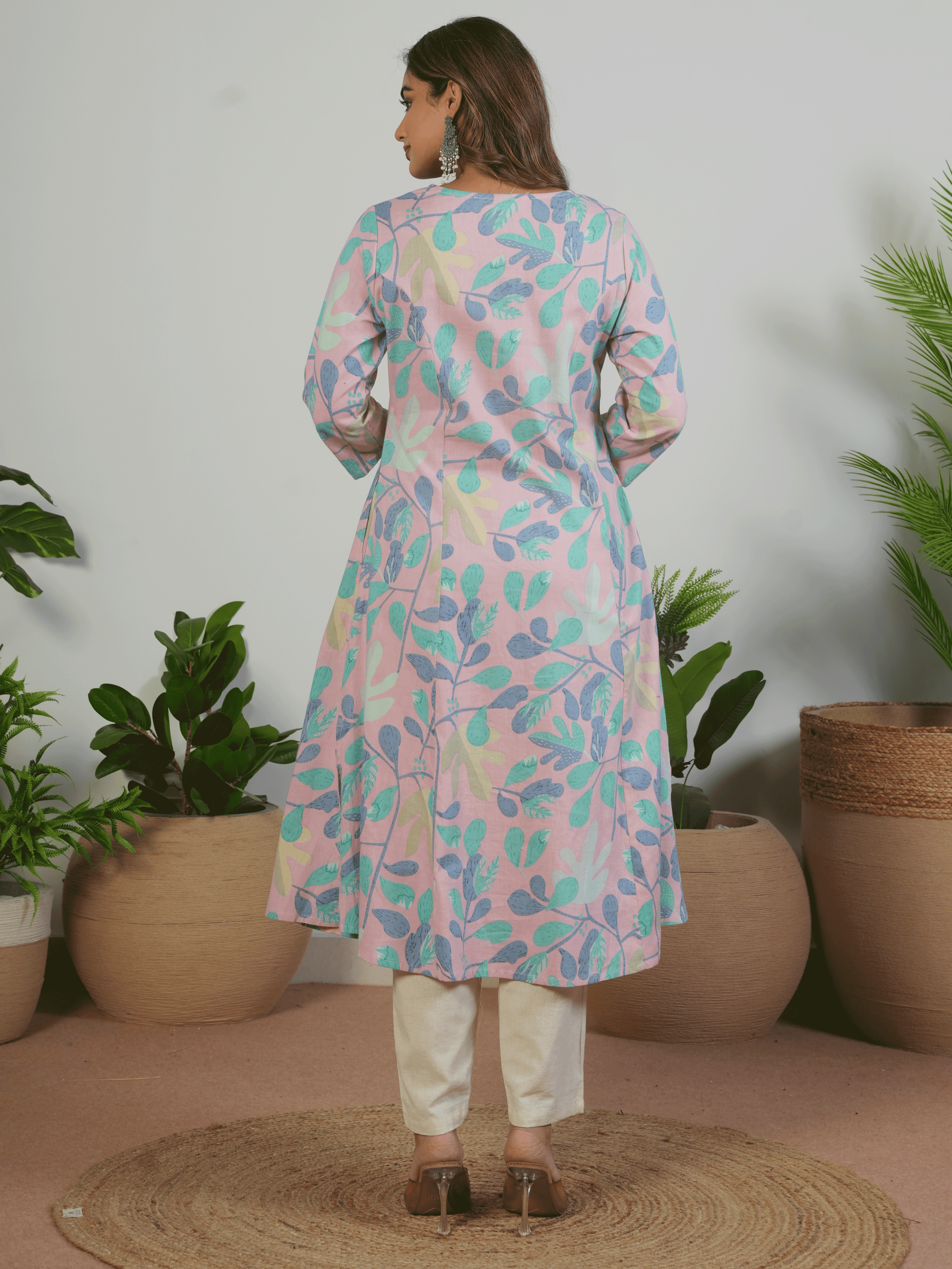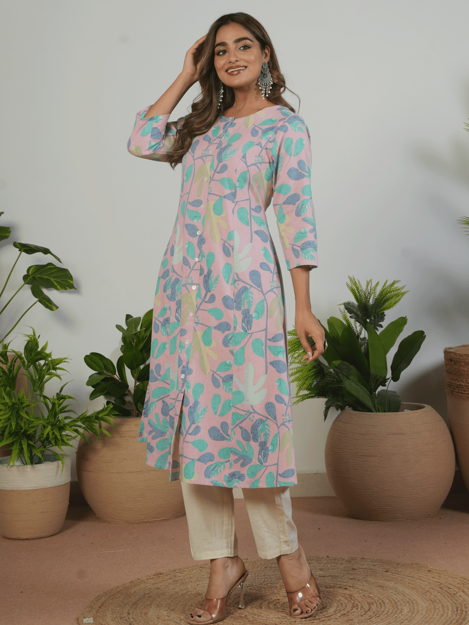 This Baby Pink A-line kurta in soft Linen Cotton is a timeless pick for festive and casual wear. Designed with a Round neckline and 3/4 Sleeve sleeves, its graceful Calf Length cut flatters all body types. The delicate Floral detailing adds a touch of sophistication. Pair it with statement earrings and juttis for a polished look. Maintain its pristine look by following proper care instructions.