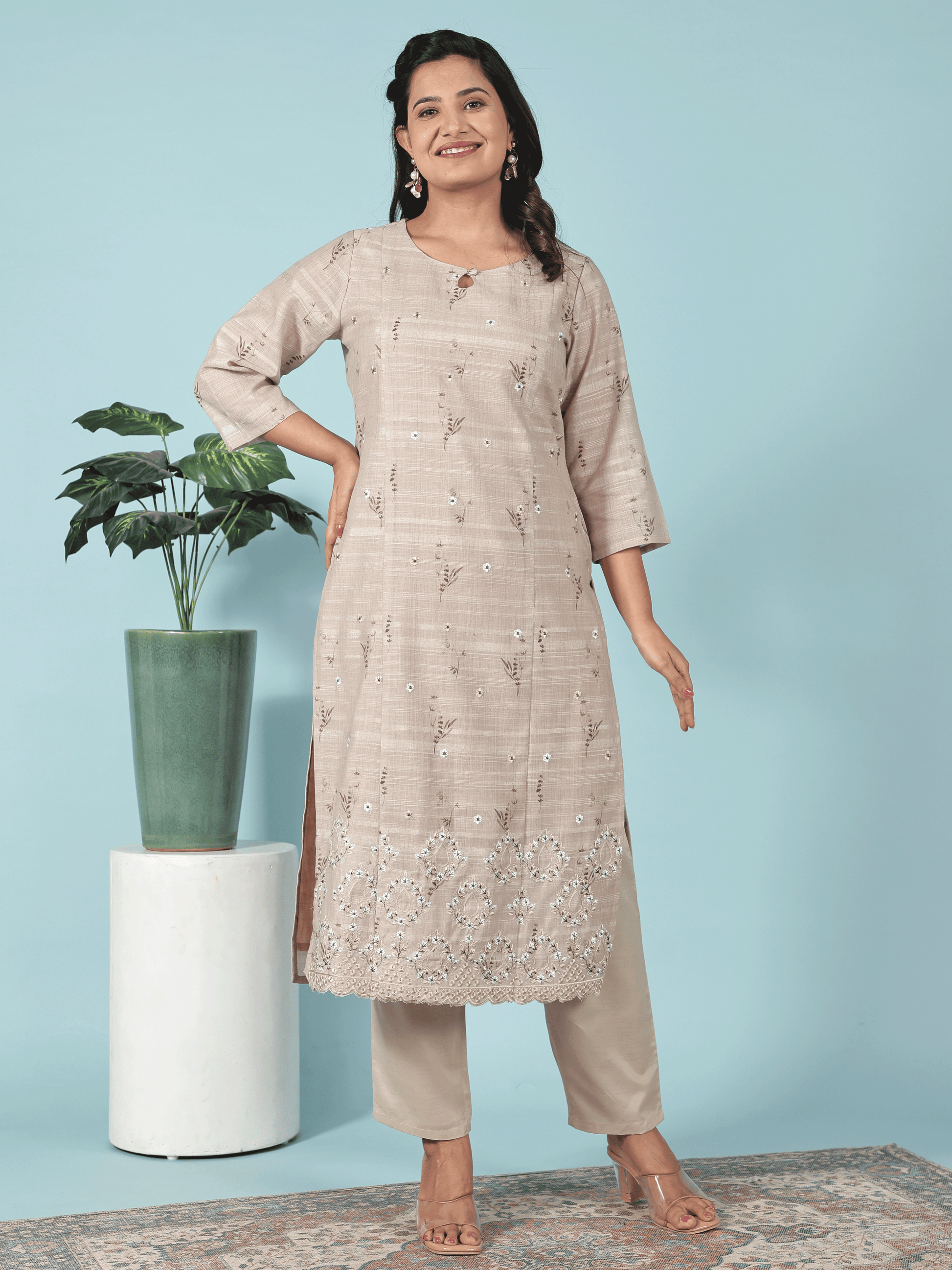 Embroidered Chanderi Floral Panelled Beige Kurta