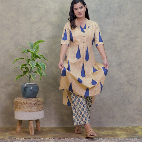 This Beige Soft Cotton kurta with a Straight flare is designed for comfort and style. Featuring a V neckline, 3/4 Sleeve sleeves, and a graceful Calf Length hemline, it’s perfect for festive wear or semi-formal gatherings. The Foliage highlights add depth and texture, making it a standout piece. Accessorise with a contrasting dupatta and keep it pristine by following proper care instructions.