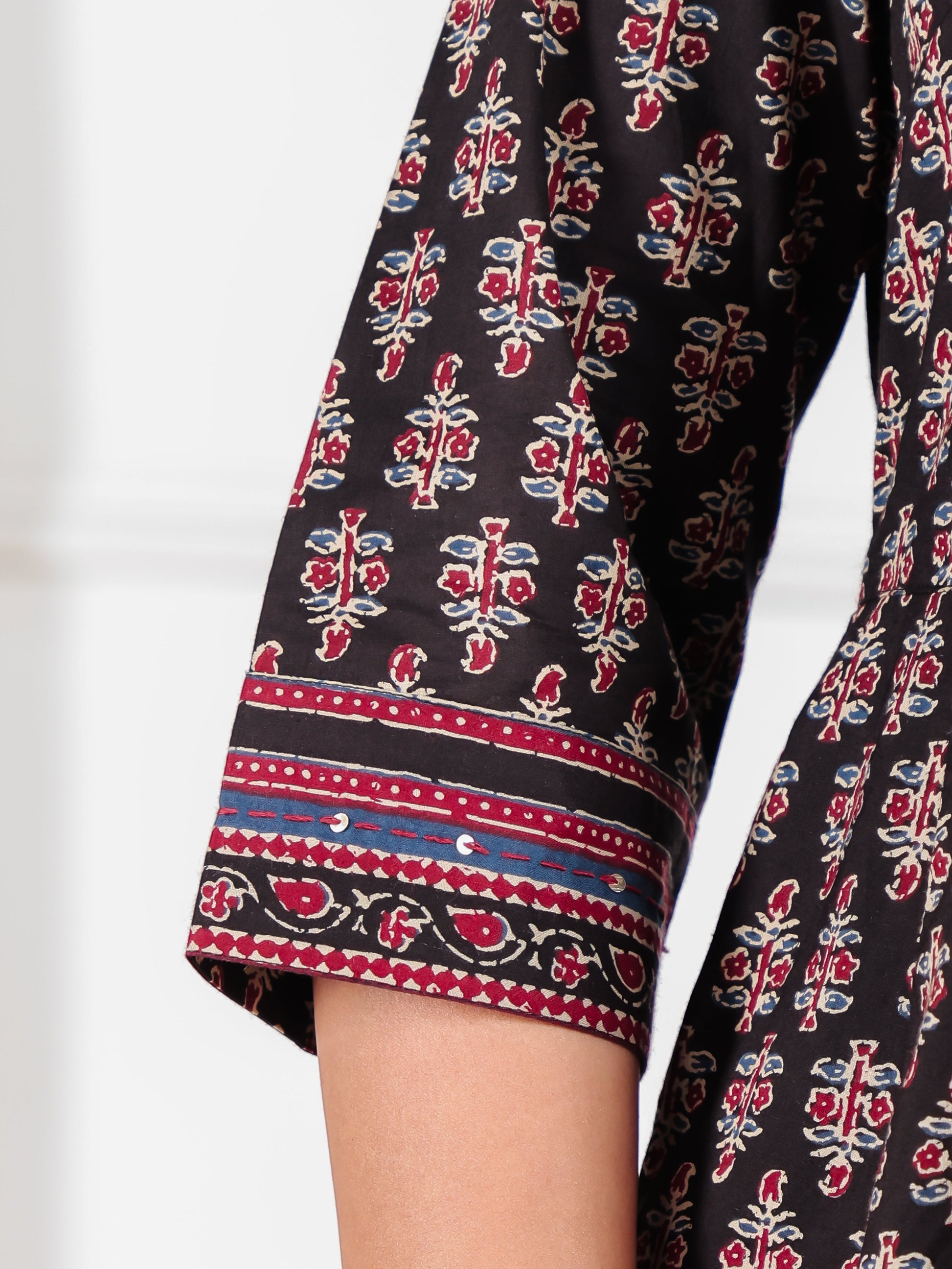 Crafted from breathable Soft Cotton, this Anarkali kurta in Black blends traditional design with everyday comfort. The Ajrakh finish adds artisanal charm, while the Calf Length silhouette ensures effortless elegance. Style with palazzos or leggings for versatile looks, from workdays to weekend outings. Designed for easy care, this kurta stays beautiful with simple care instructions.