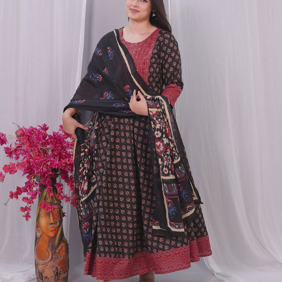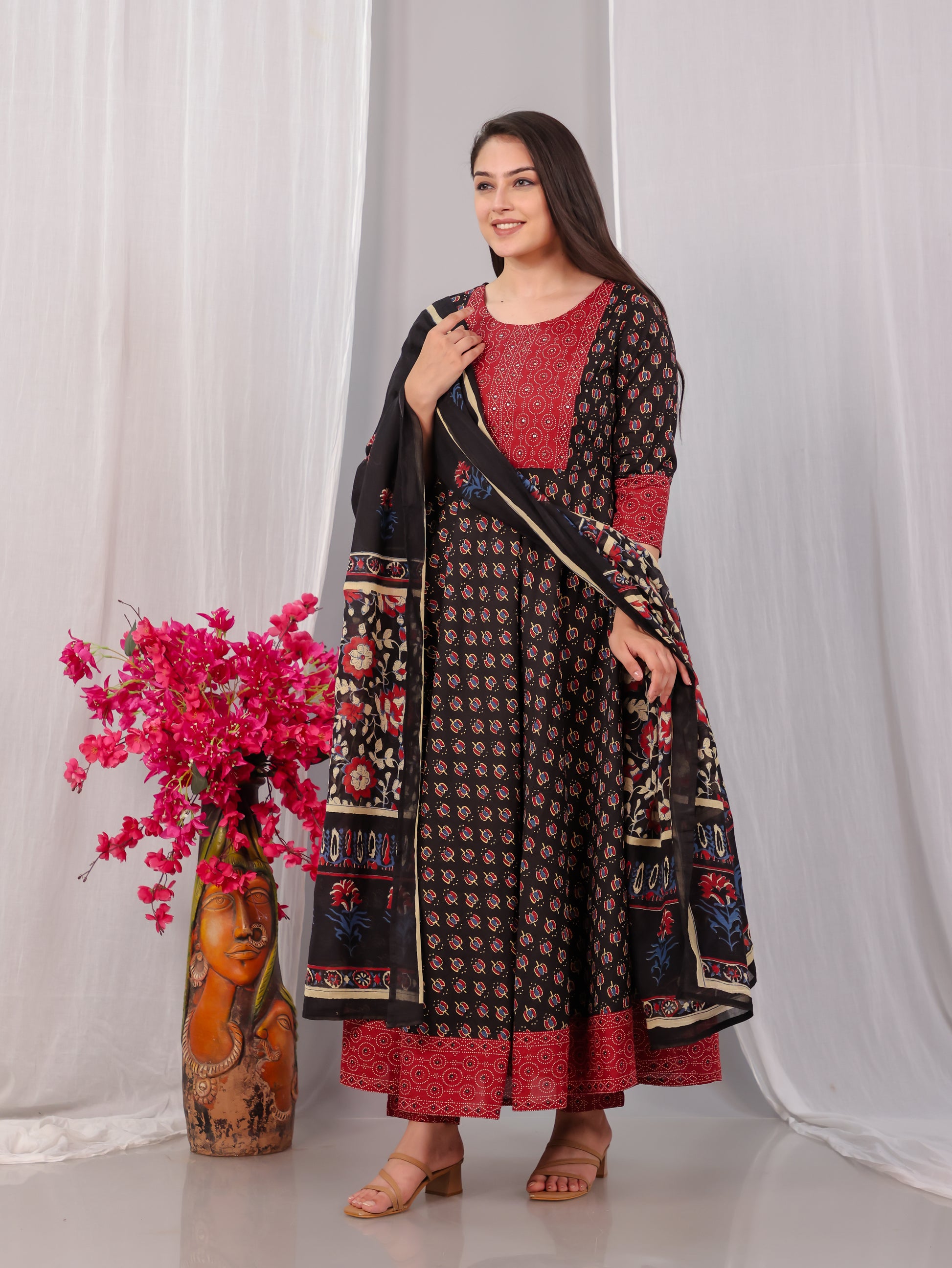 Embroidered Soft Cotton Block Print Anarkali Black Kurta