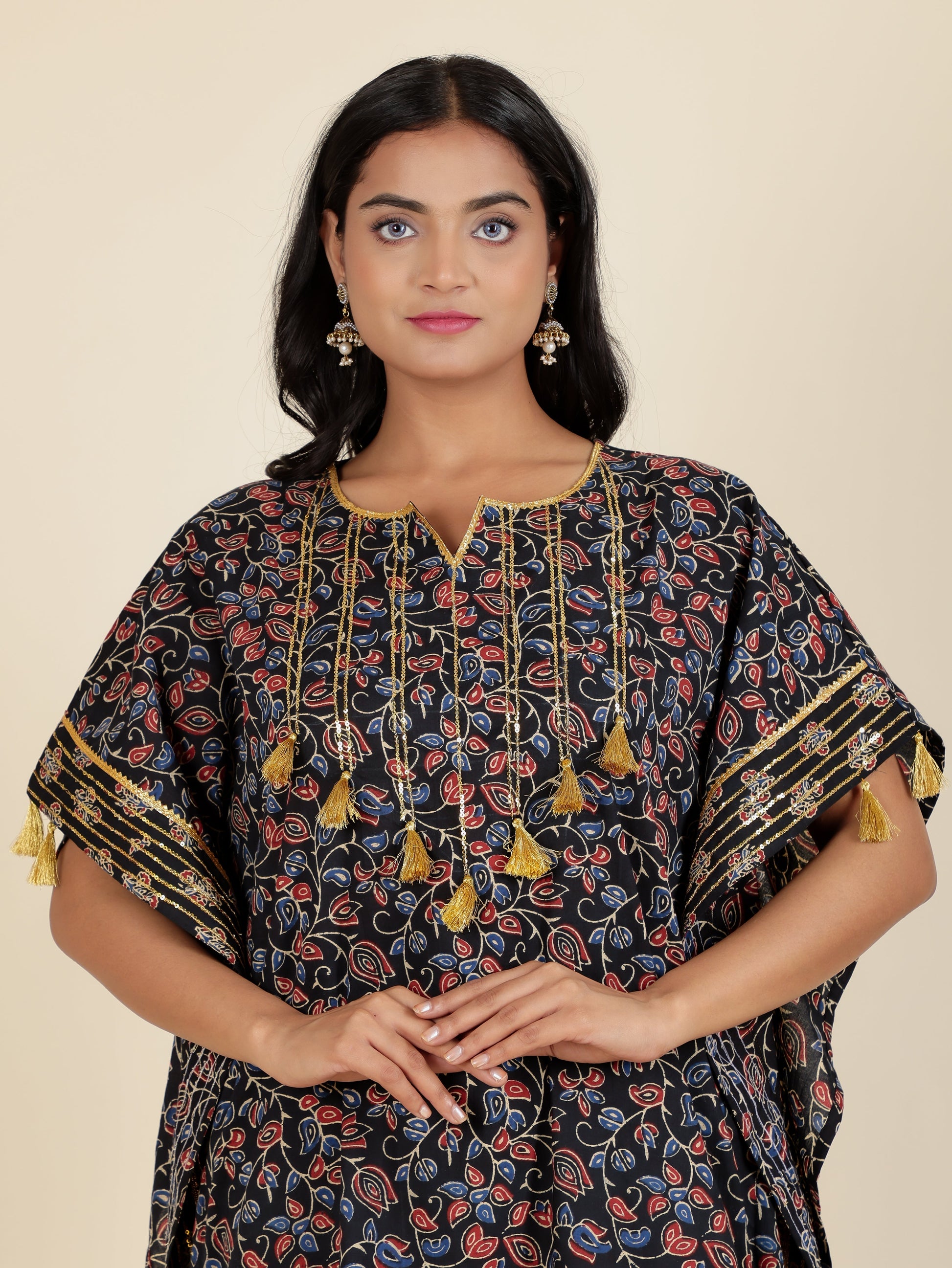 Elevate your ethnic wardrobe with this Soft Cotton kurta in a stunning Black hue. Featuring an elegant Kaftan fit and striking Floral accents, it’s perfect for festive celebrations or family gatherings. The Round neckline and Short Sleeve provide all-day comfort. Team with gold-toned accessories for an effortlessly chic vibe. Maintain its charm by following proper care instructions.