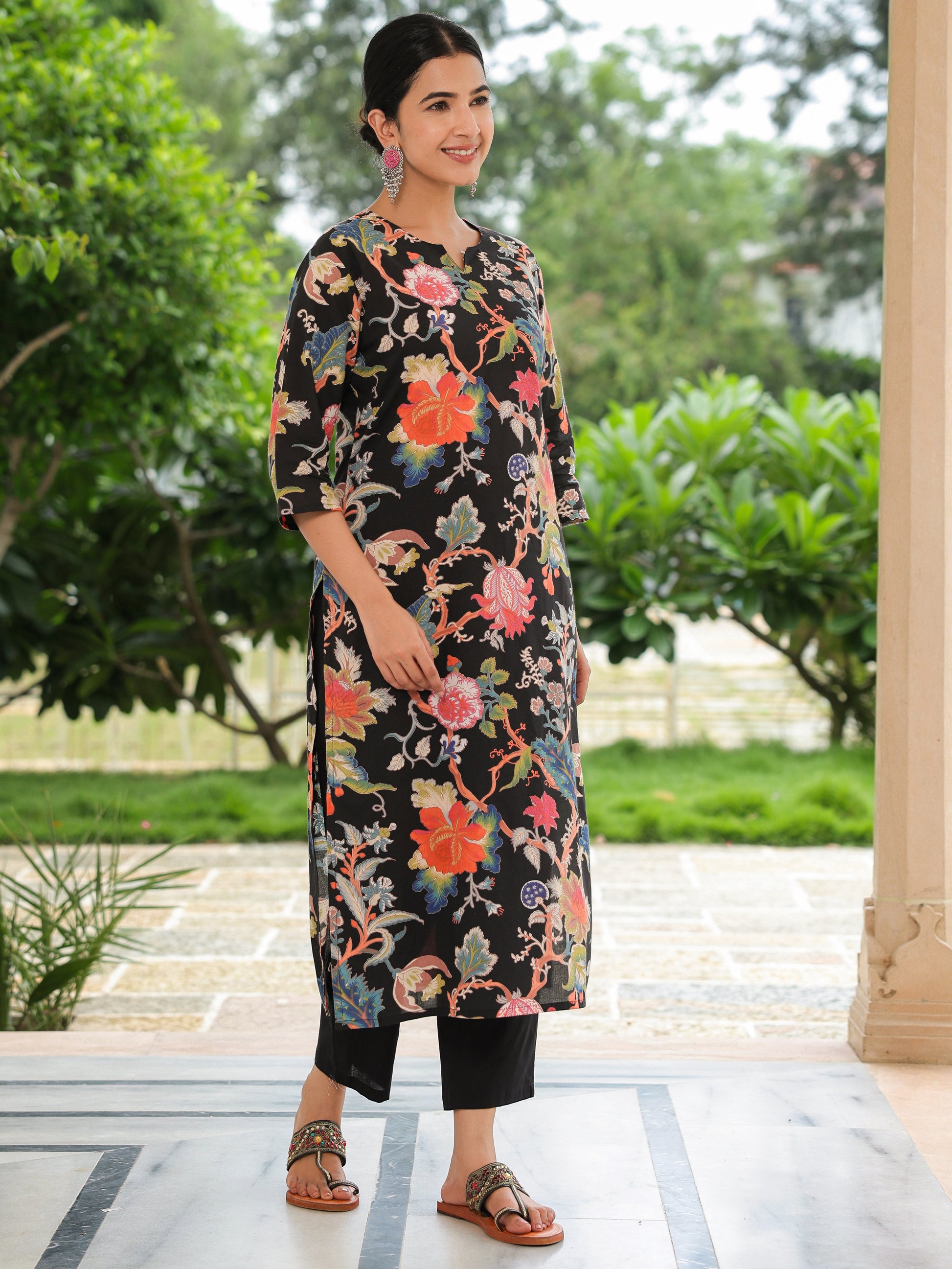 This Black Soft Cotton kurta with a Straight flare is designed for comfort and style. Featuring a Round neckline, 3/4 Sleeve sleeves, and a graceful Calf Length hemline, it’s perfect for festive wear or semi-formal gatherings. The Floral highlights add depth and texture, making it a standout piece. Accessorise with a contrasting dupatta and keep it pristine by following proper care instructions.
