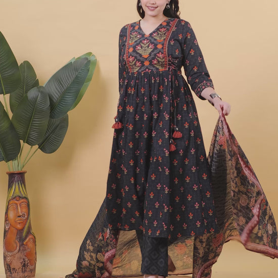 Soft Cotton Floral Flared Black Kurta