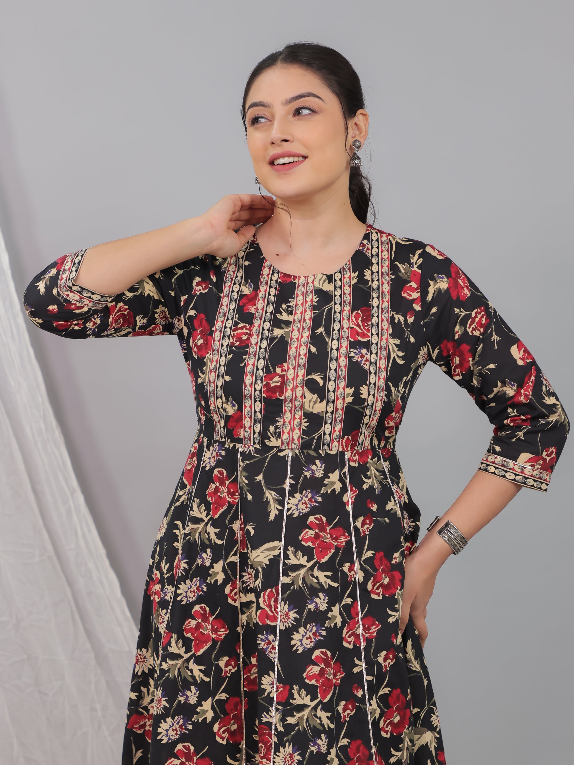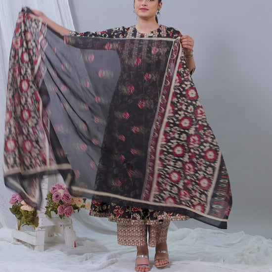 Soft Cotton Floral Flared Black Kurta