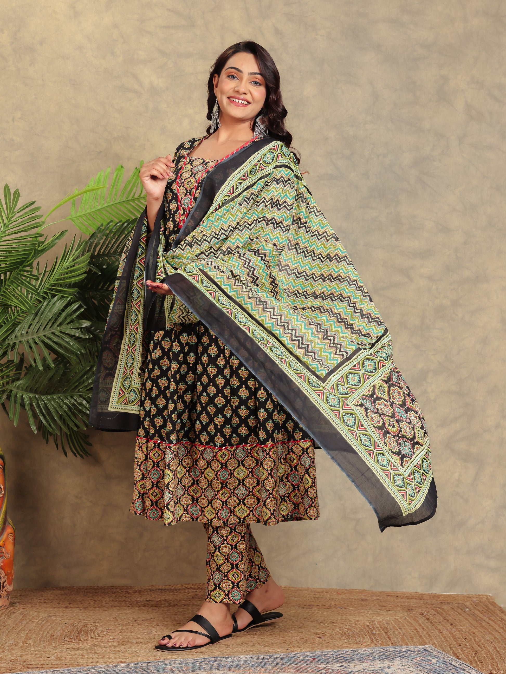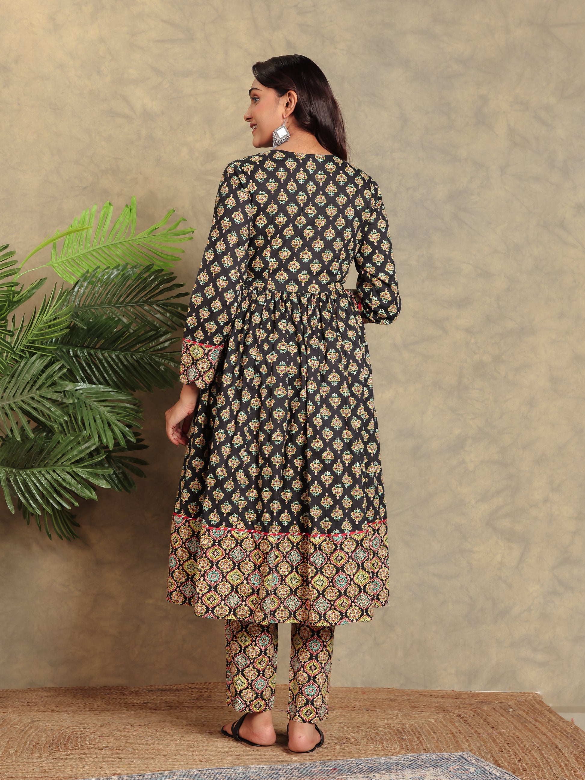 Embroidered Soft Cotton Floral Anarkali Black Kurta