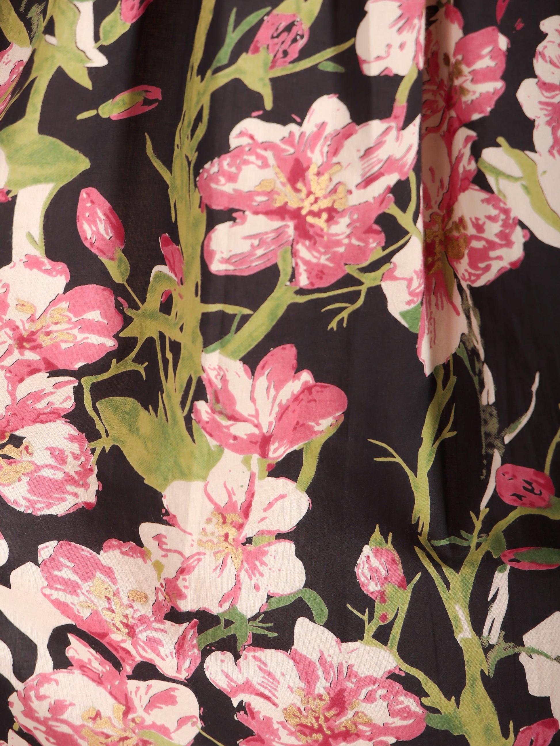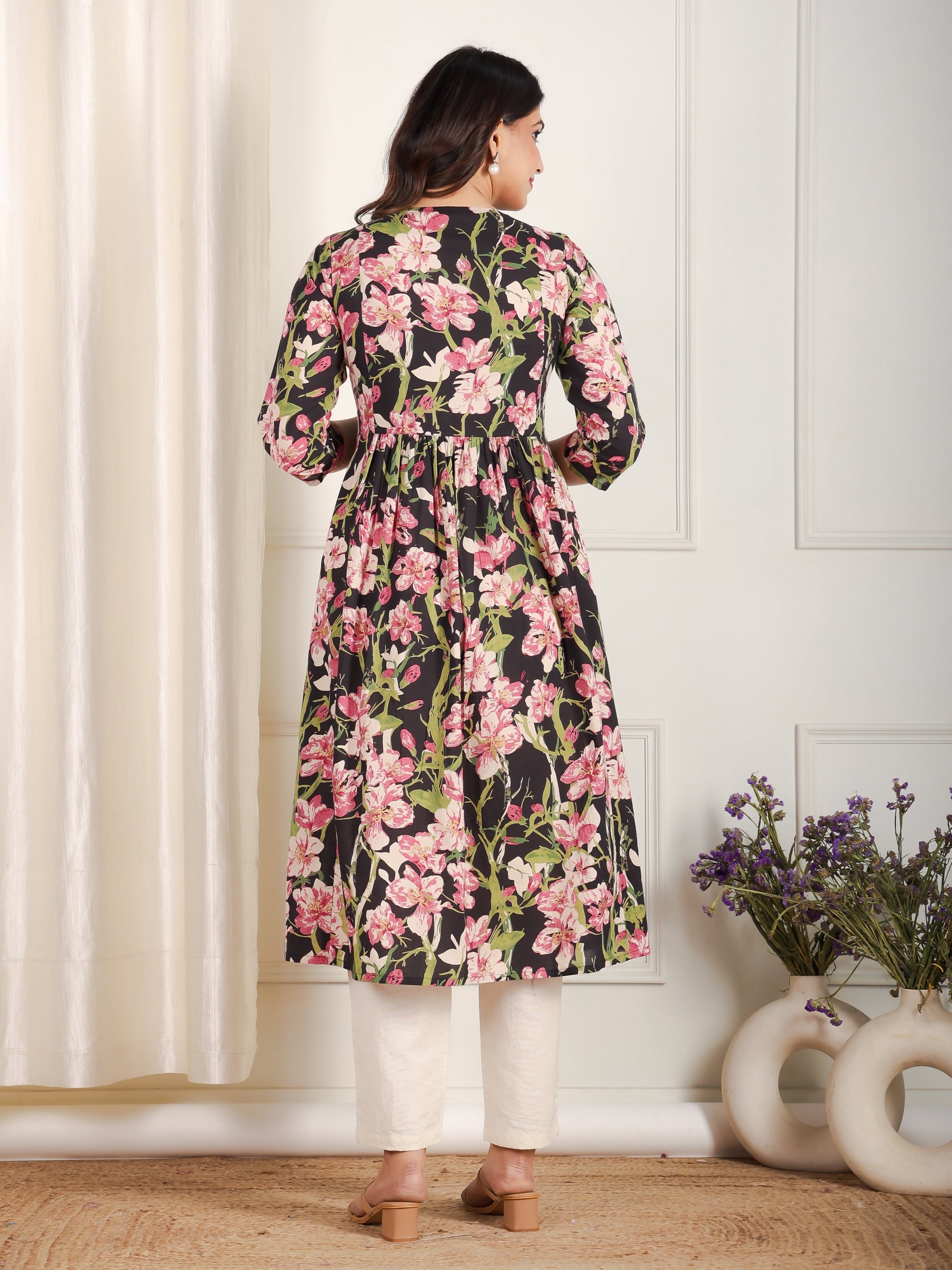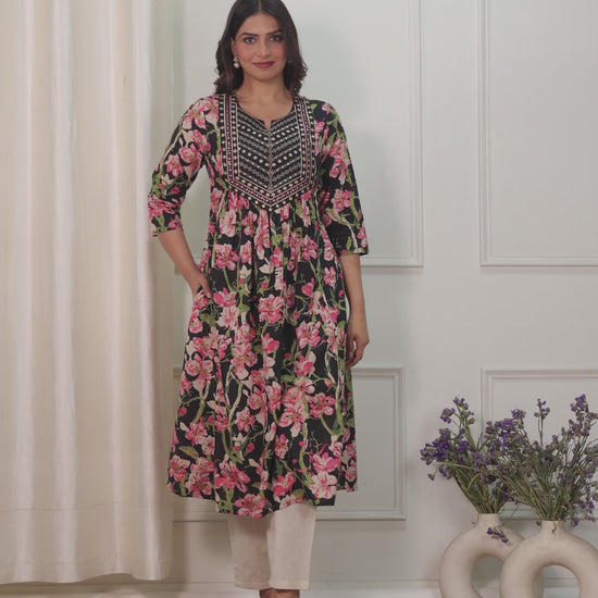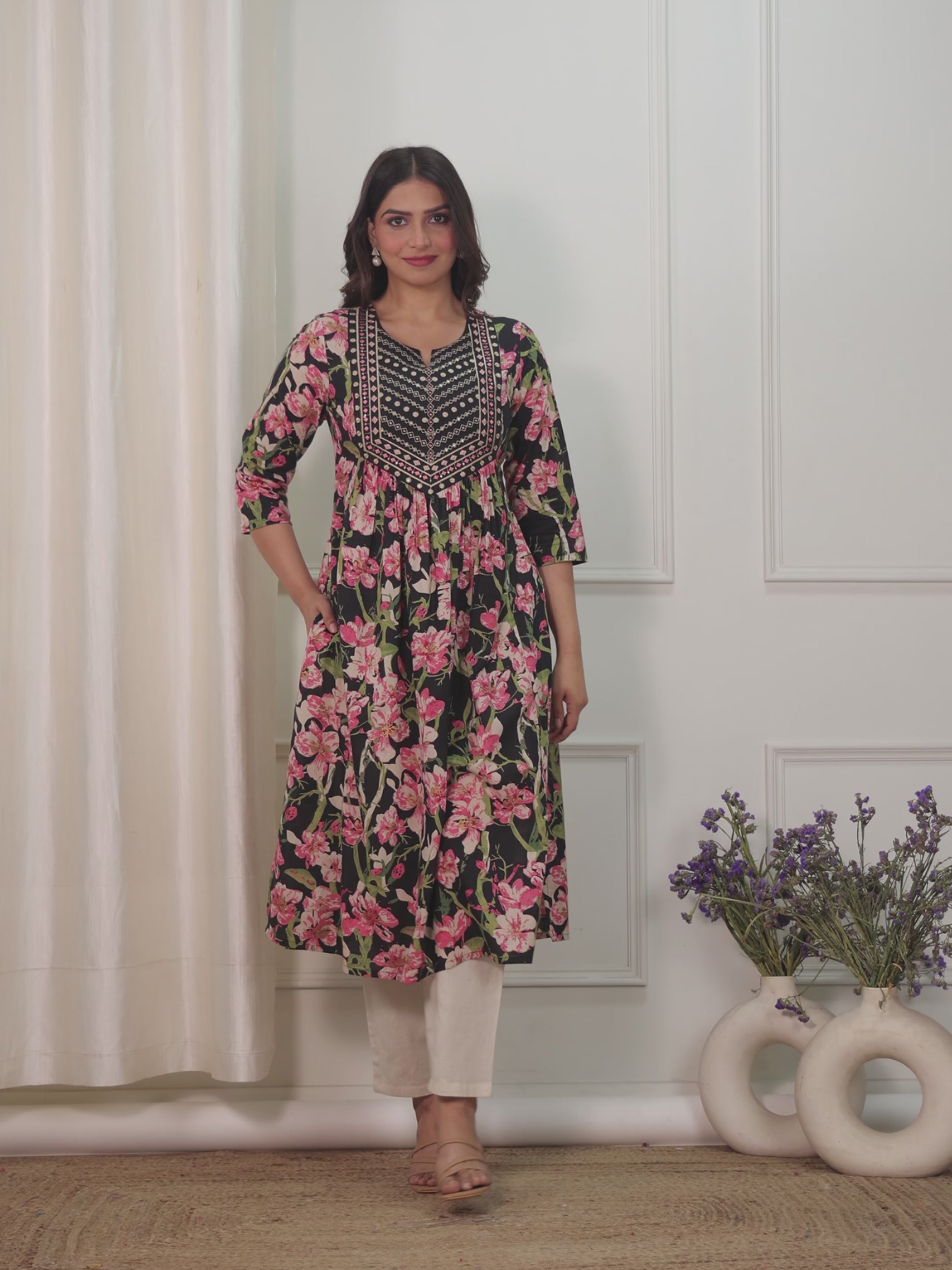 Embroidered Soft Cotton Floral A-line Black Kurta