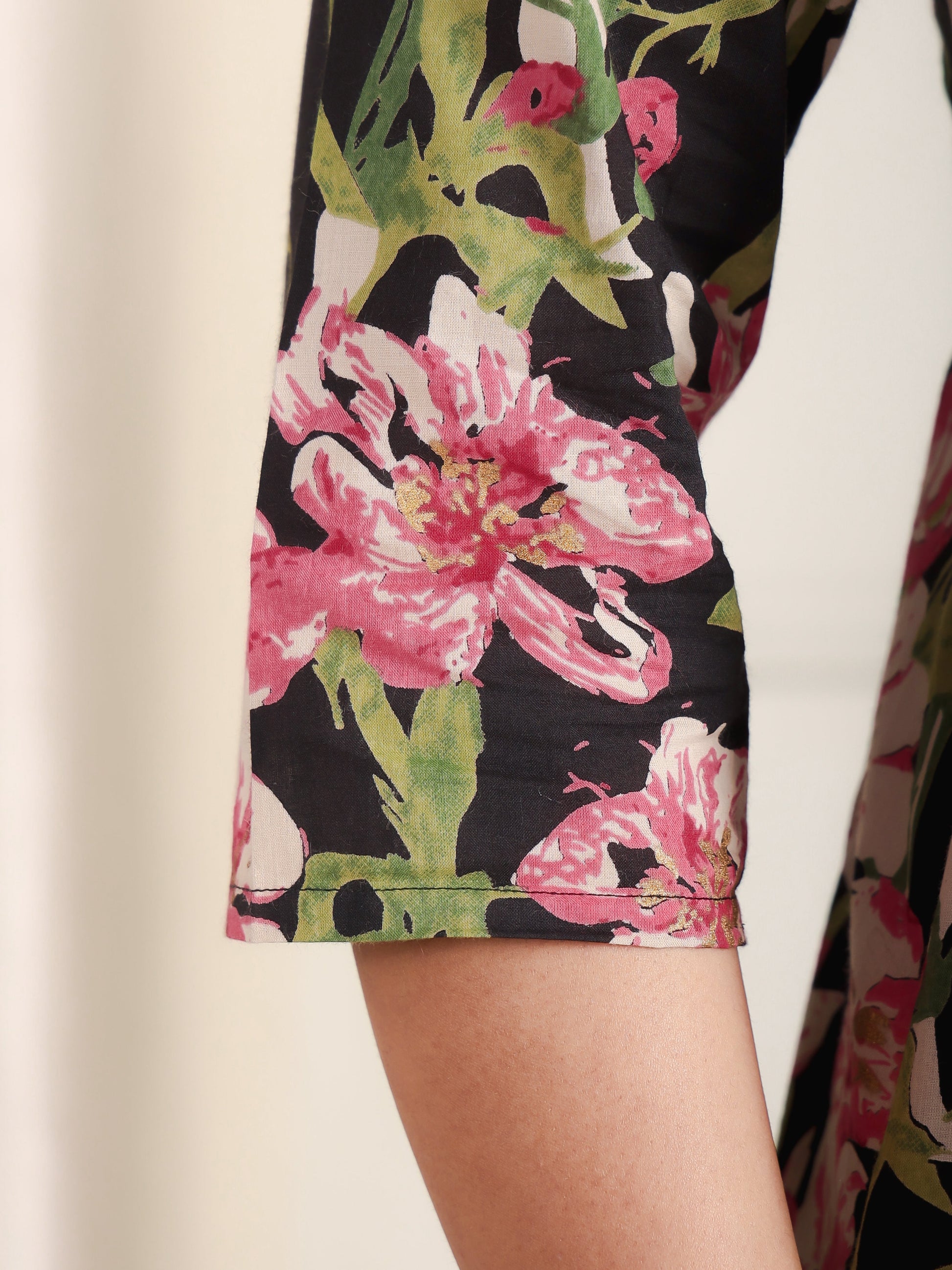Elevate your ethnic wardrobe with this Soft Cotton kurta in a stunning Black hue. Featuring an elegant A-line fit and striking Floral accents, it’s perfect for festive celebrations or family gatherings. The Round neckline and 3/4 Sleeve provide all-day comfort. Team with gold-toned accessories for an effortlessly chic vibe. Maintain its charm by following proper care instructions.