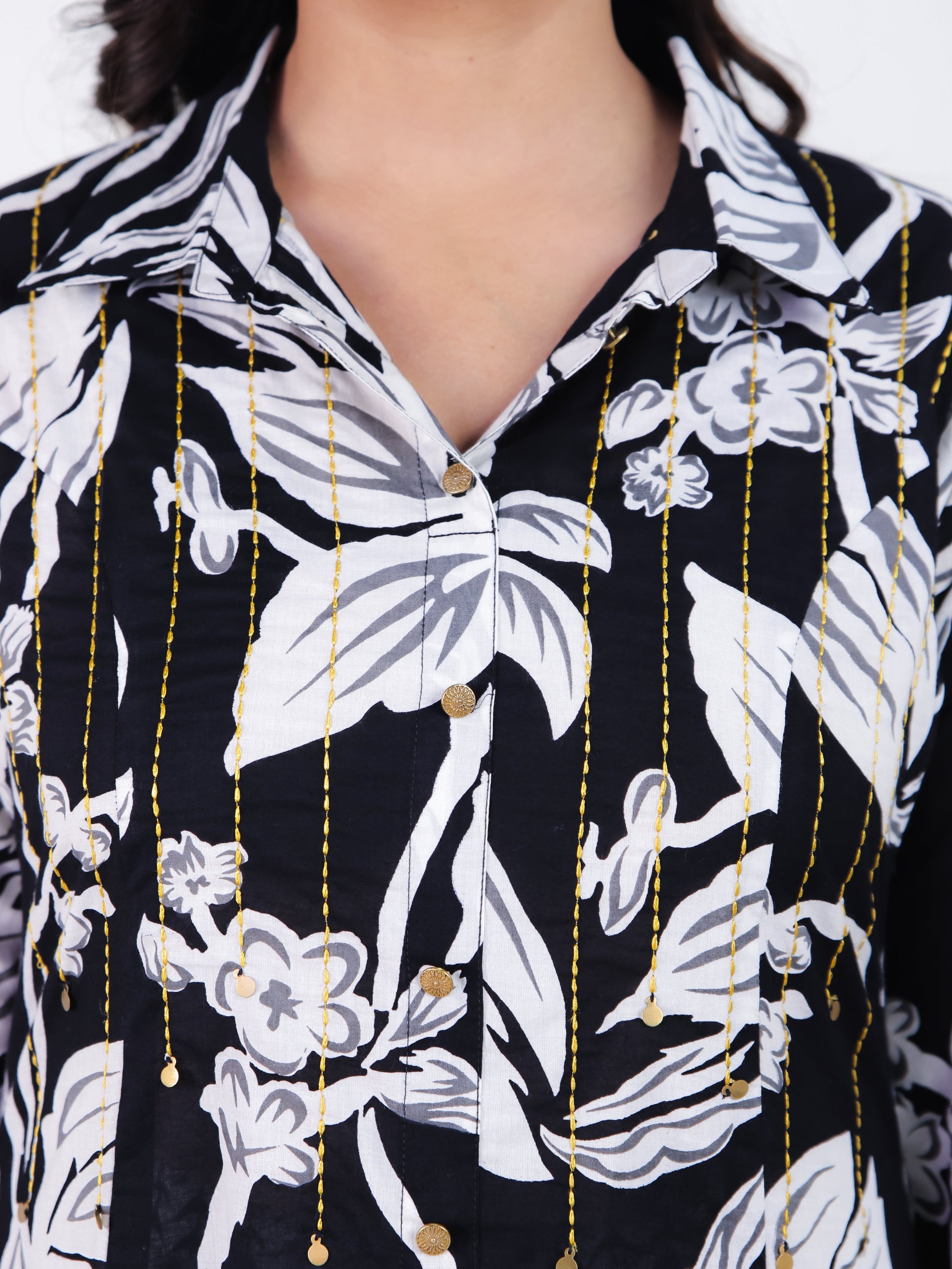 Embroidered Soft Cotton Floral High Low Black Kurta
