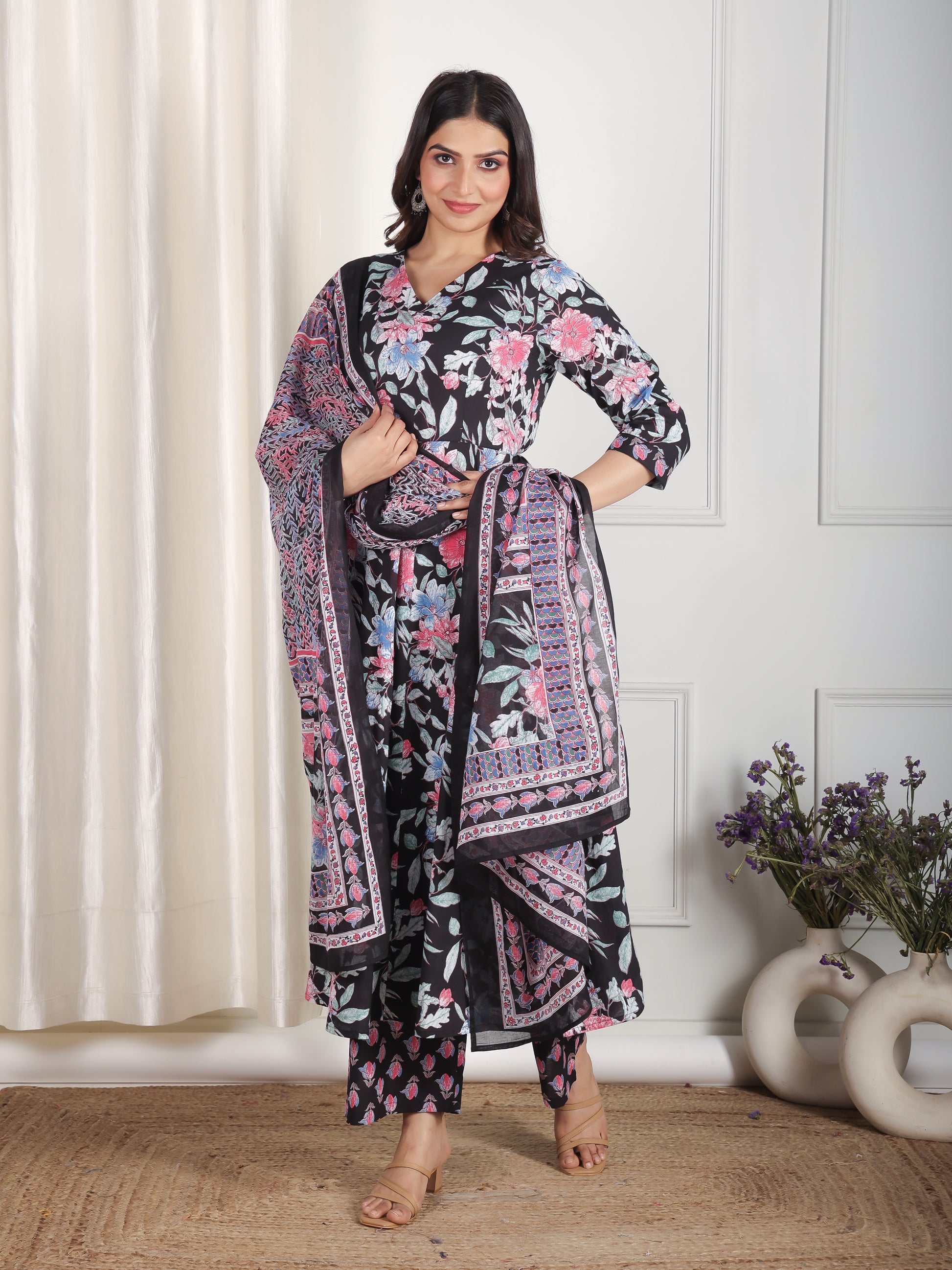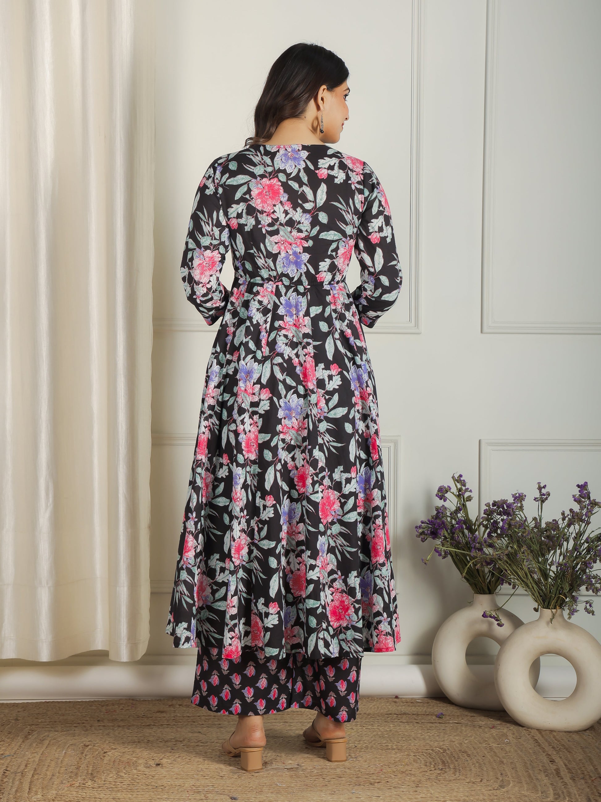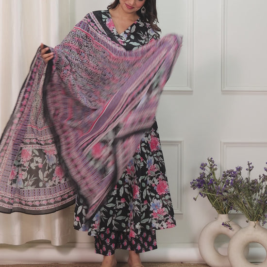 This Black Soft Cotton kurta with a Flared flare is designed for comfort and style. Featuring a V neckline, 3/4 Sleeve sleeves, and a graceful Calf Length hemline, it’s perfect for festive wear or semi-formal gatherings. The Floral highlights add depth and texture, making it a standout piece. Accessorise with a contrasting dupatta and keep it pristine by following proper care instructions.