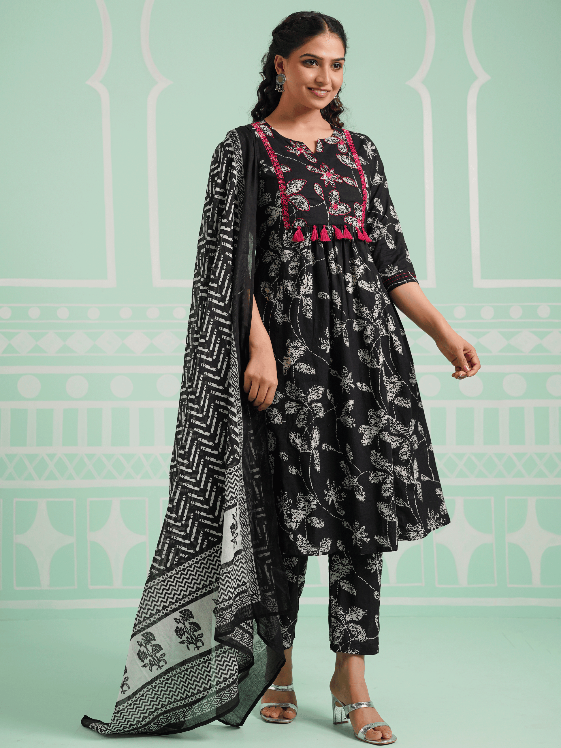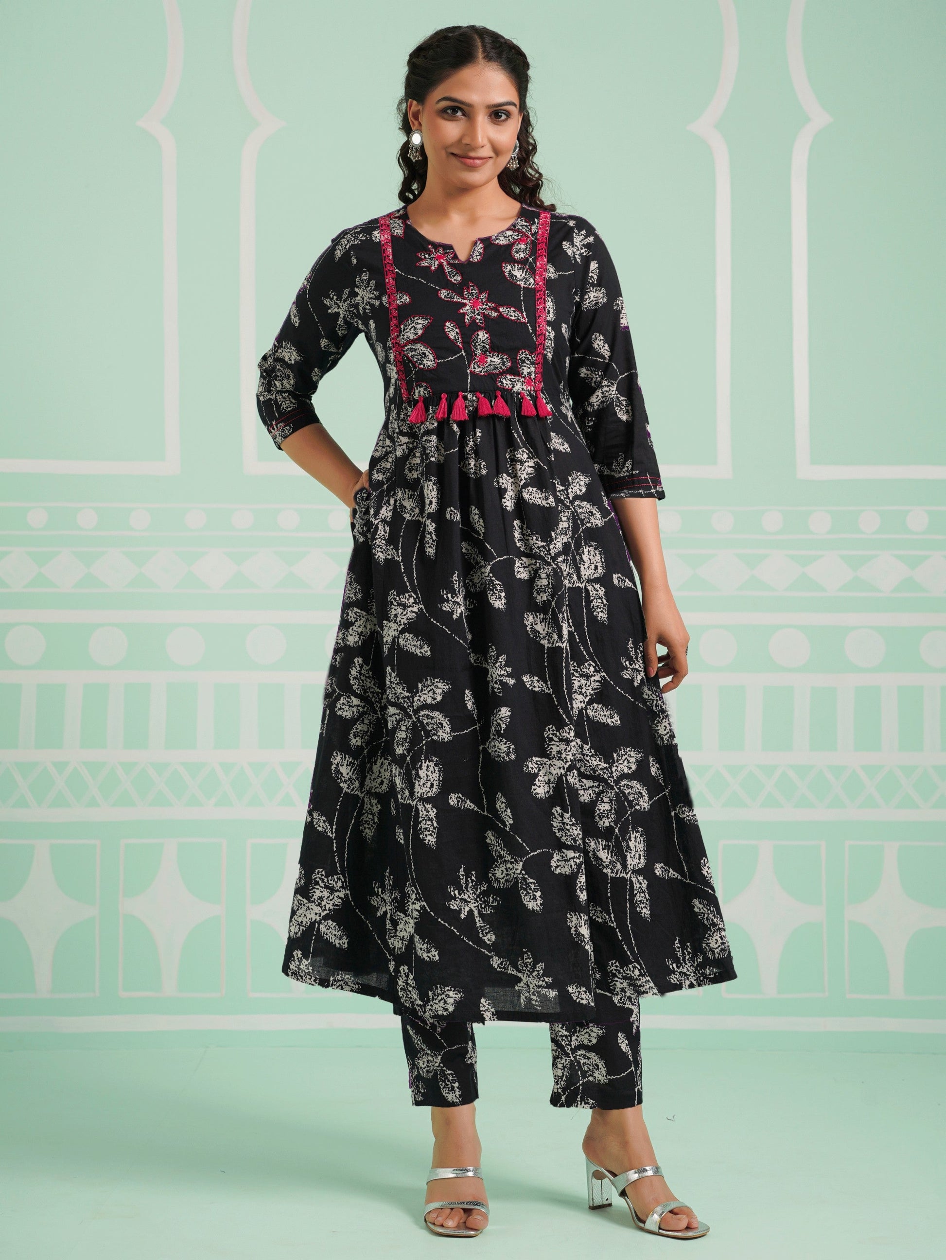 Soft Cotton Floral Panelled Black Kurta