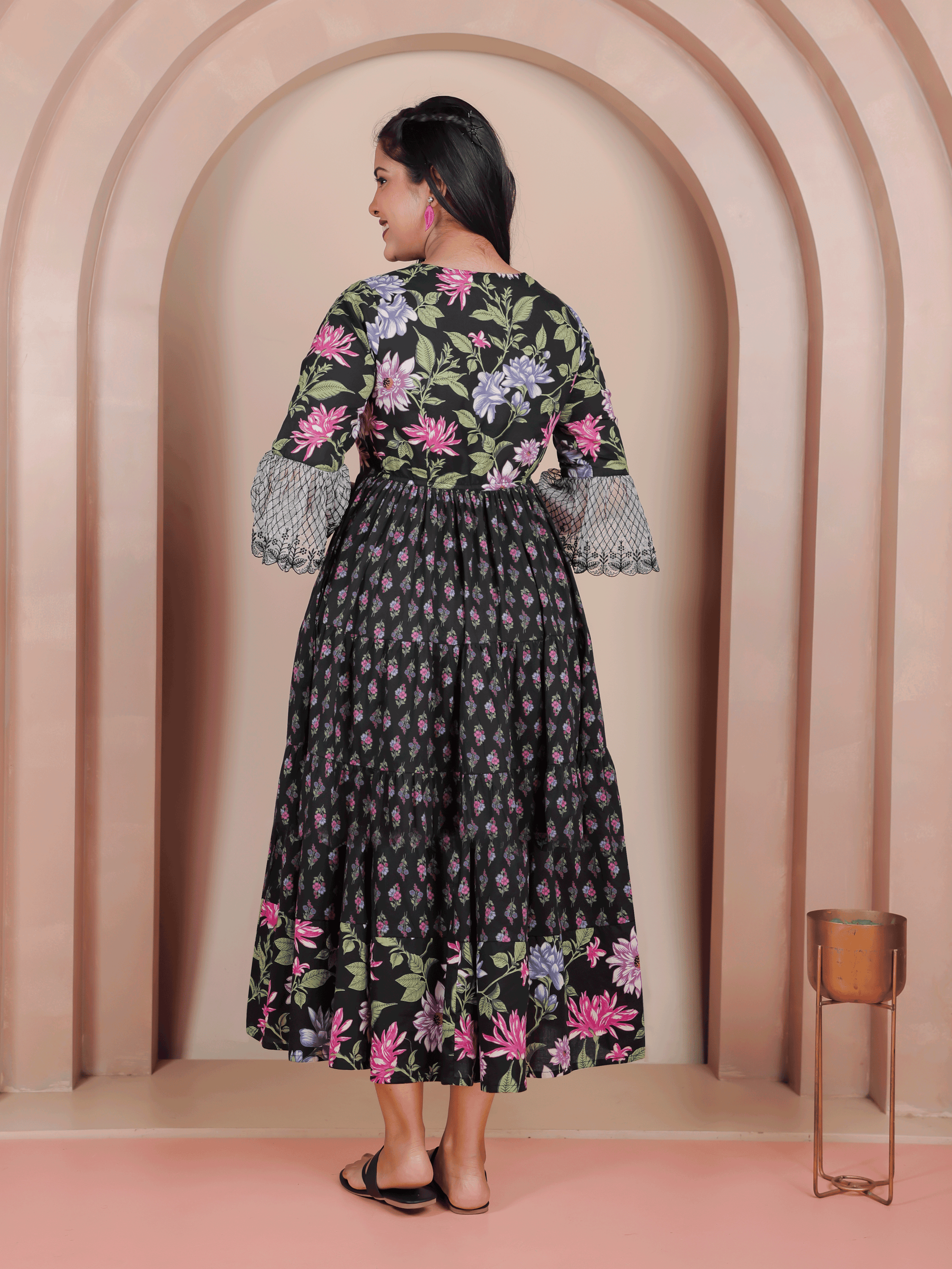 Add a stylish staple to your wardrobe with this Flared dress in Black. The breathable Soft Cotton fabric keeps you comfortable all day, while the Floral motifs and subtle work elements create a sophisticated charm. Dress it up with heels or keep it casual with flats.