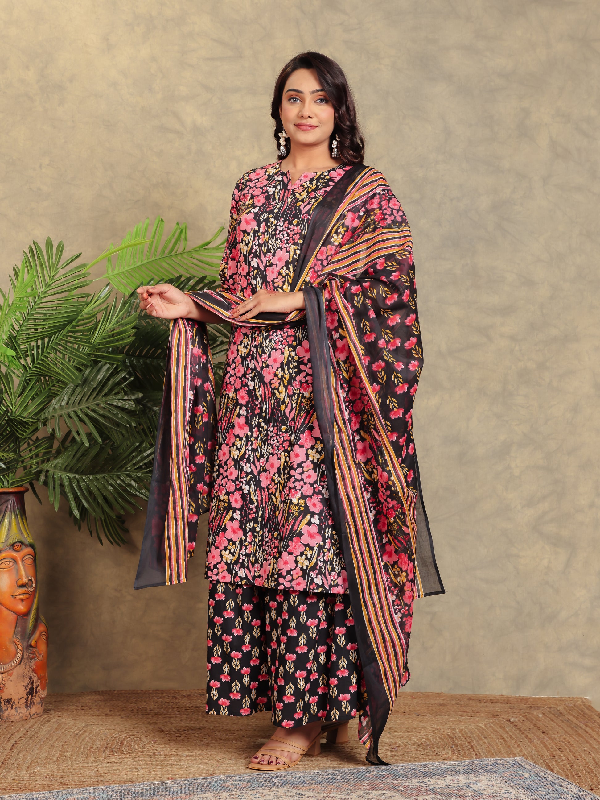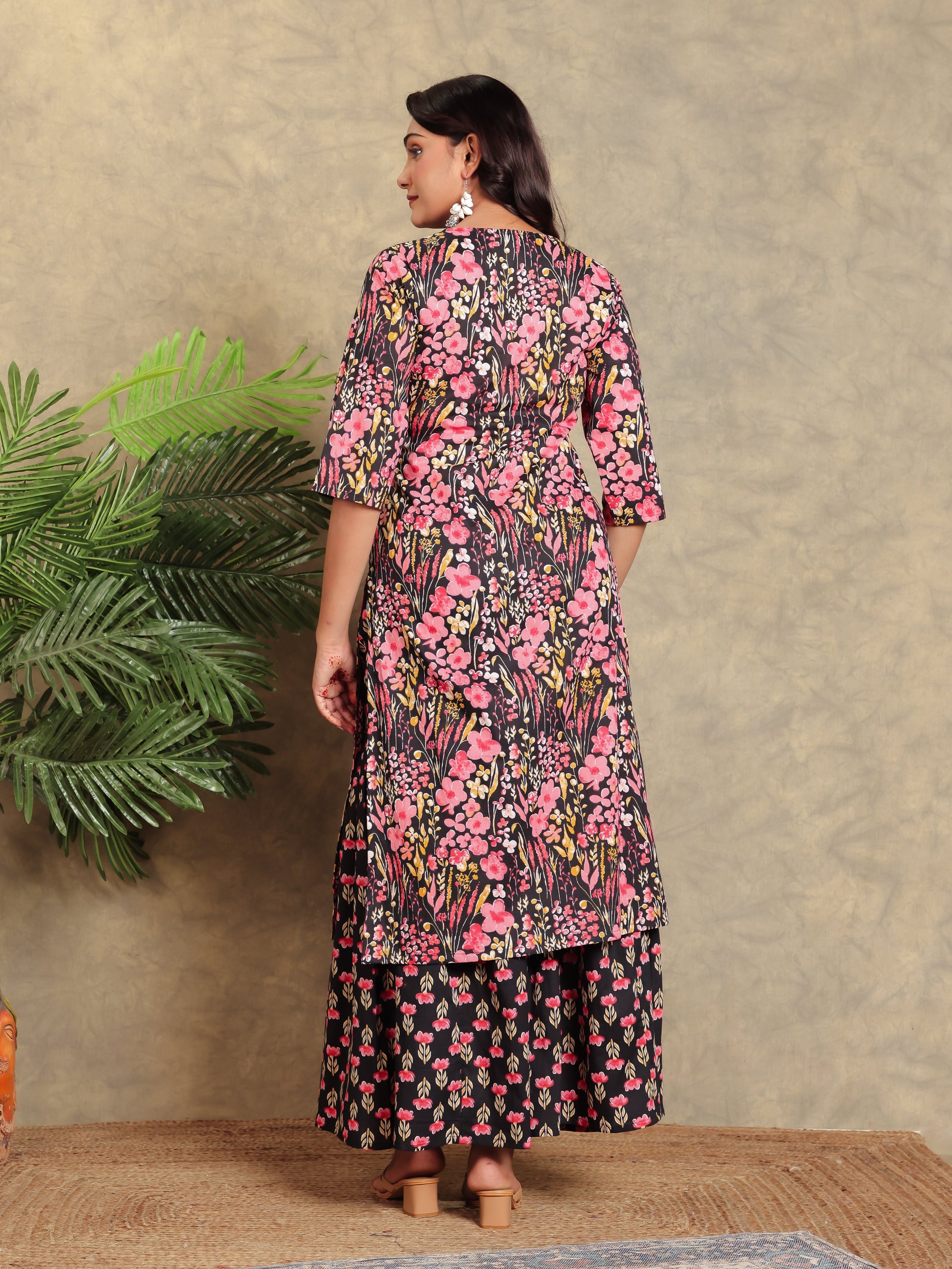 This Black Soft Cotton kurta with a Straight flare is designed for comfort and style. Featuring a Round neckline, 3/4 Sleeve sleeves, and a graceful Calf Length hemline, it’s perfect for festive wear or semi-formal gatherings. The Floral highlights add depth and texture, making it a standout piece. Accessorise with a contrasting dupatta and keep it pristine by following proper care instructions.