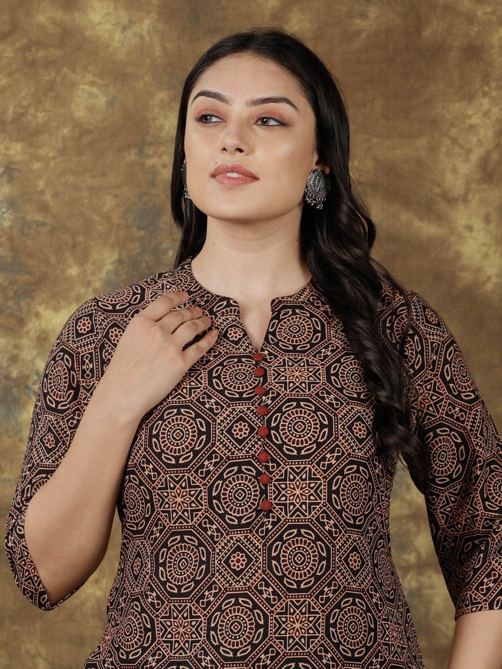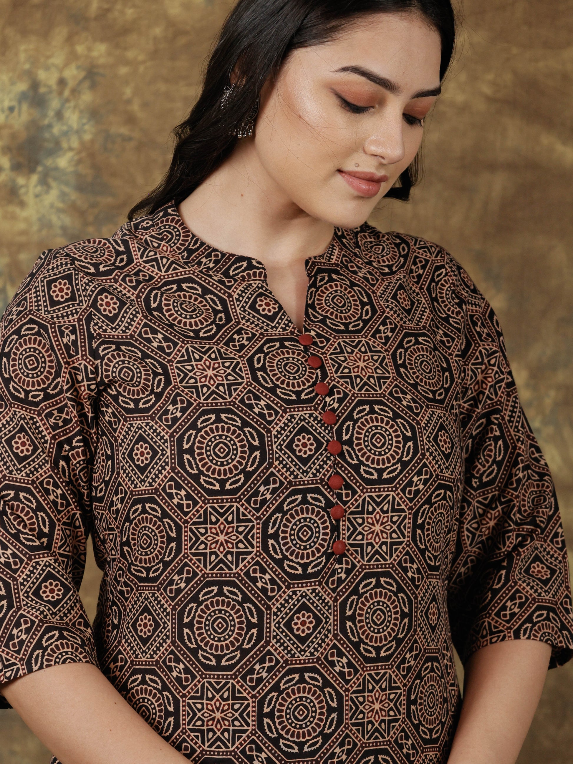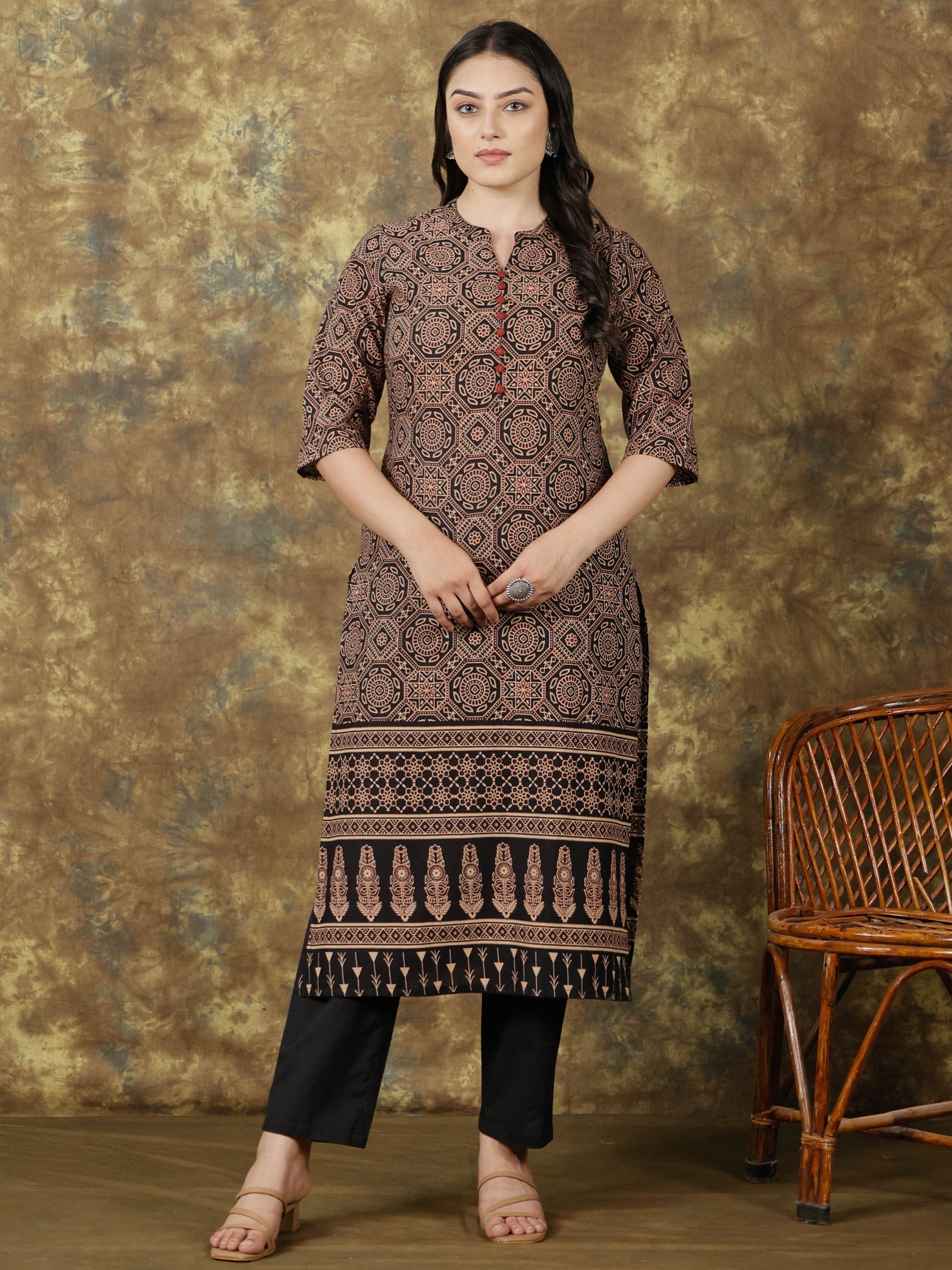 This Black Soft Cotton kurta with a Straight flare is designed for comfort and style. Featuring a Mandarin Collar neckline, 3/4 Sleeve sleeves, and a graceful Calf Length hemline, it’s perfect for festive wear or semi-formal gatherings. The Geometric highlights add depth and texture, making it a standout piece. Accessorise with a contrasting dupatta and keep it pristine by following proper care instructions.