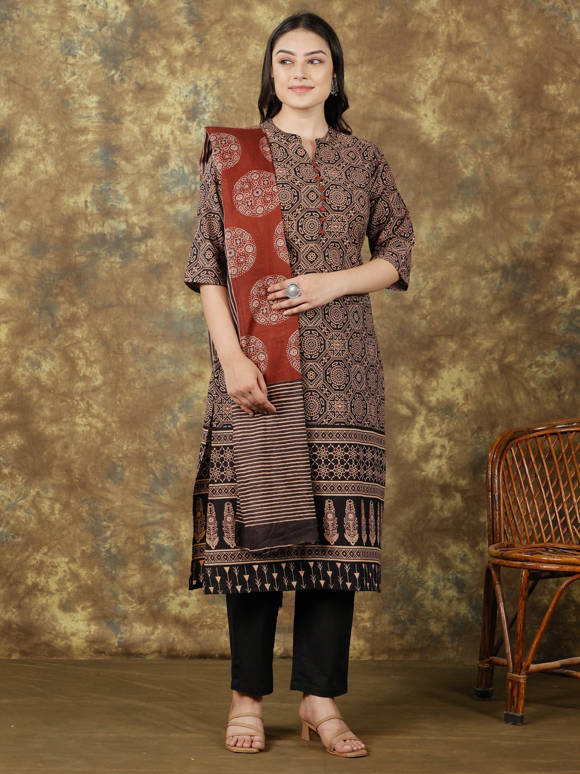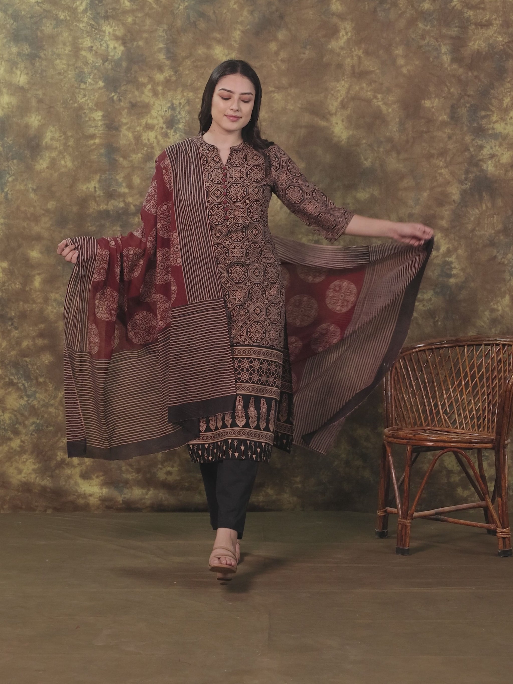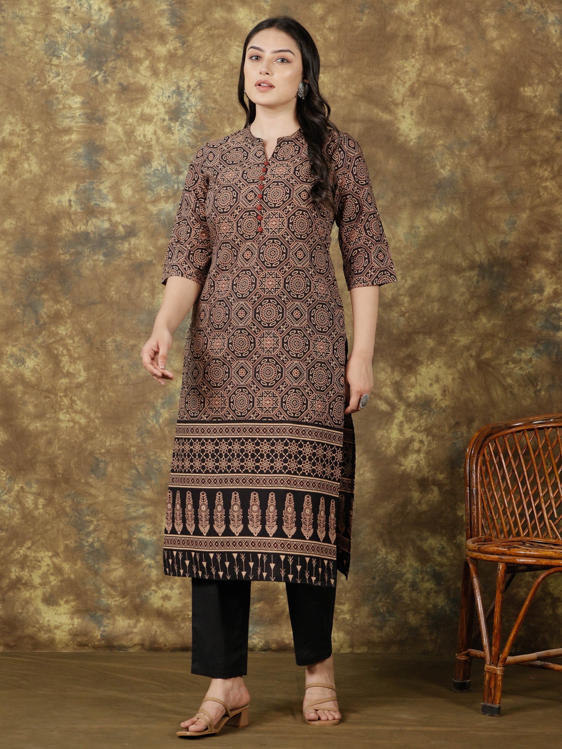 This Black Soft Cotton kurta with a Straight flare is designed for comfort and style. Featuring a Mandarin Collar neckline, 3/4 Sleeve sleeves, and a graceful Calf Length hemline, it’s perfect for festive wear or semi-formal gatherings. The Geometric highlights add depth and texture, making it a standout piece. Accessorise with a contrasting dupatta and keep it pristine by following proper care instructions.