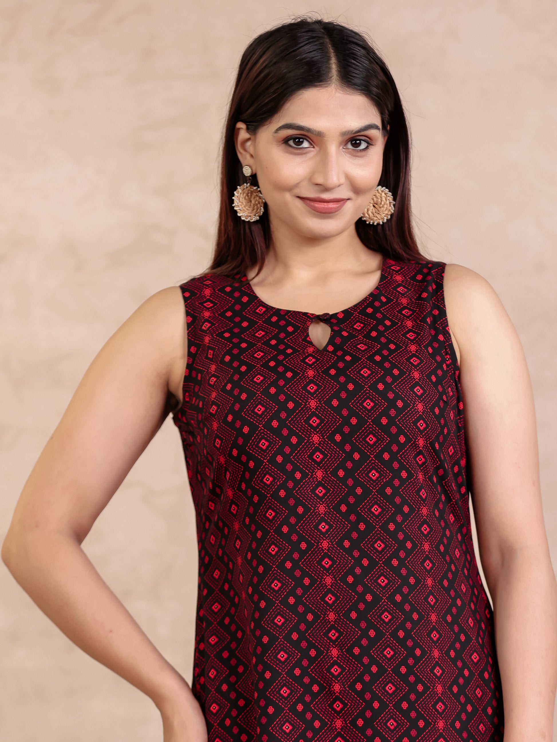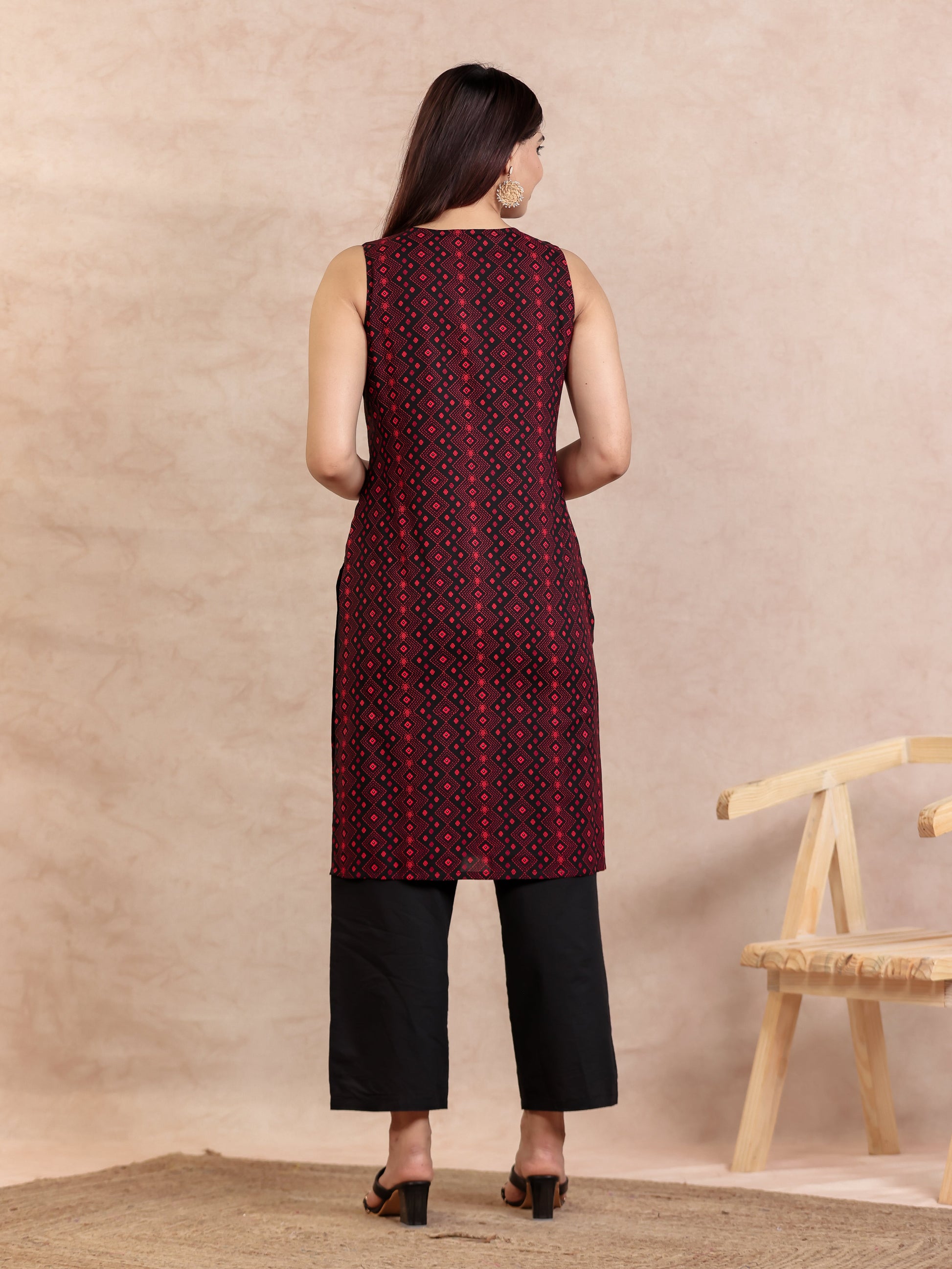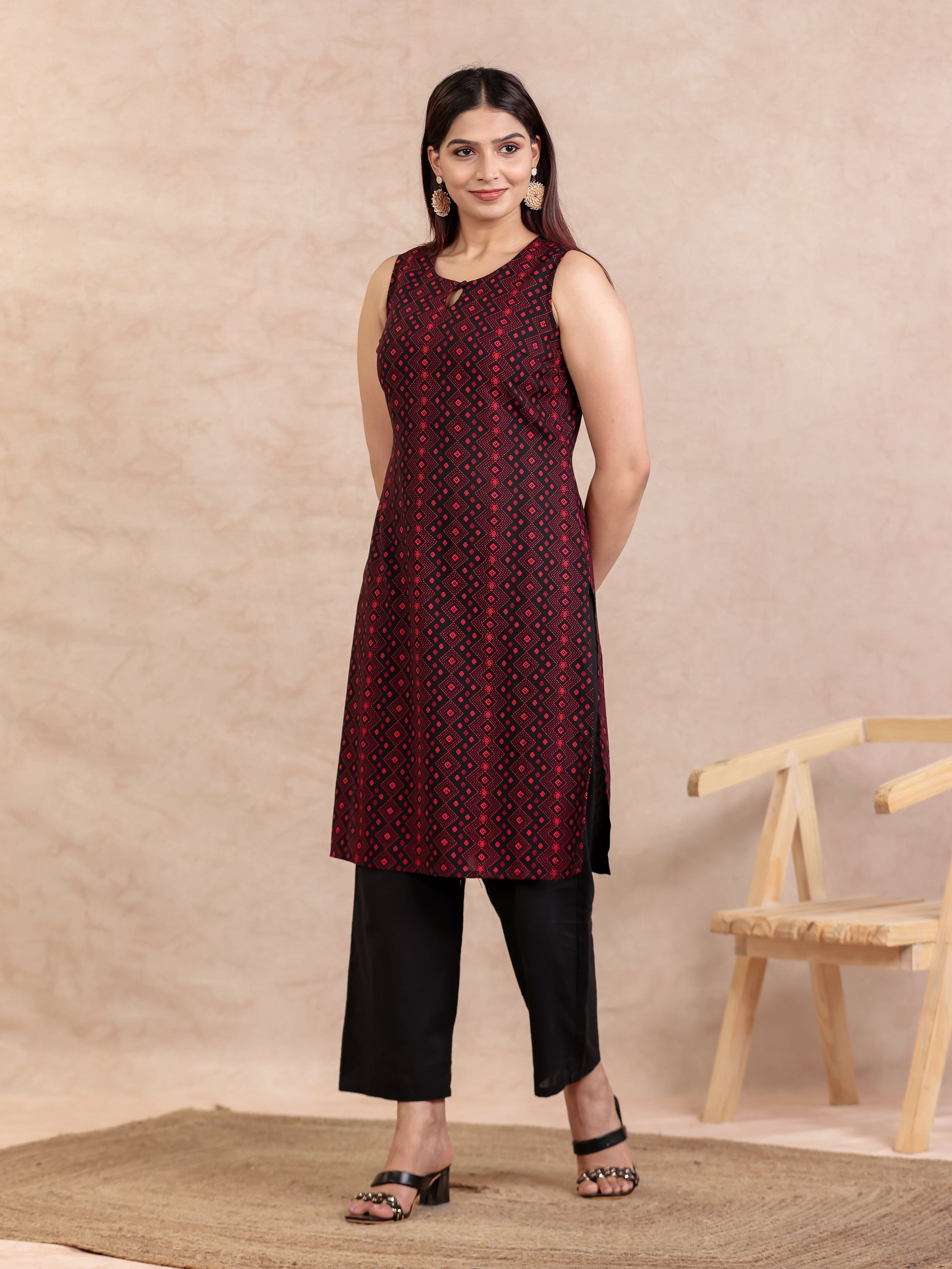 This Black Viscose kurta with a Straight flare is designed for comfort and style. Featuring a Round neckline, Sleeveless sleeves, and a graceful Calf Length hemline, it’s perfect for festive wear or semi-formal gatherings. The Geometric highlights add depth and texture, making it a standout piece. Accessorise with a contrasting dupatta and keep it pristine by following proper care instructions.