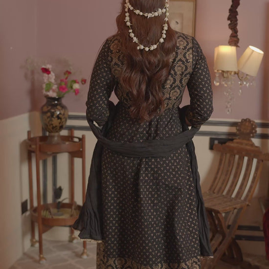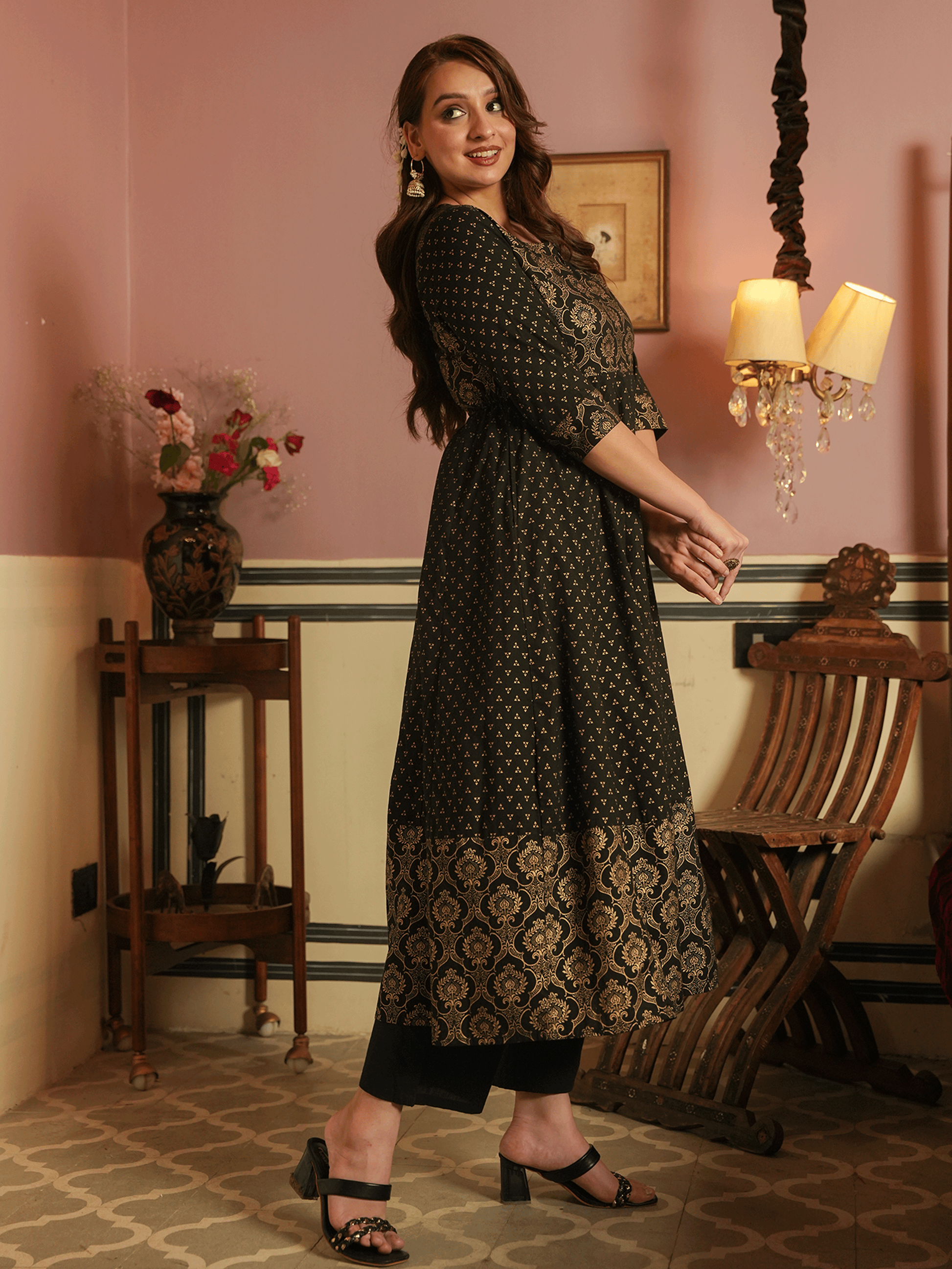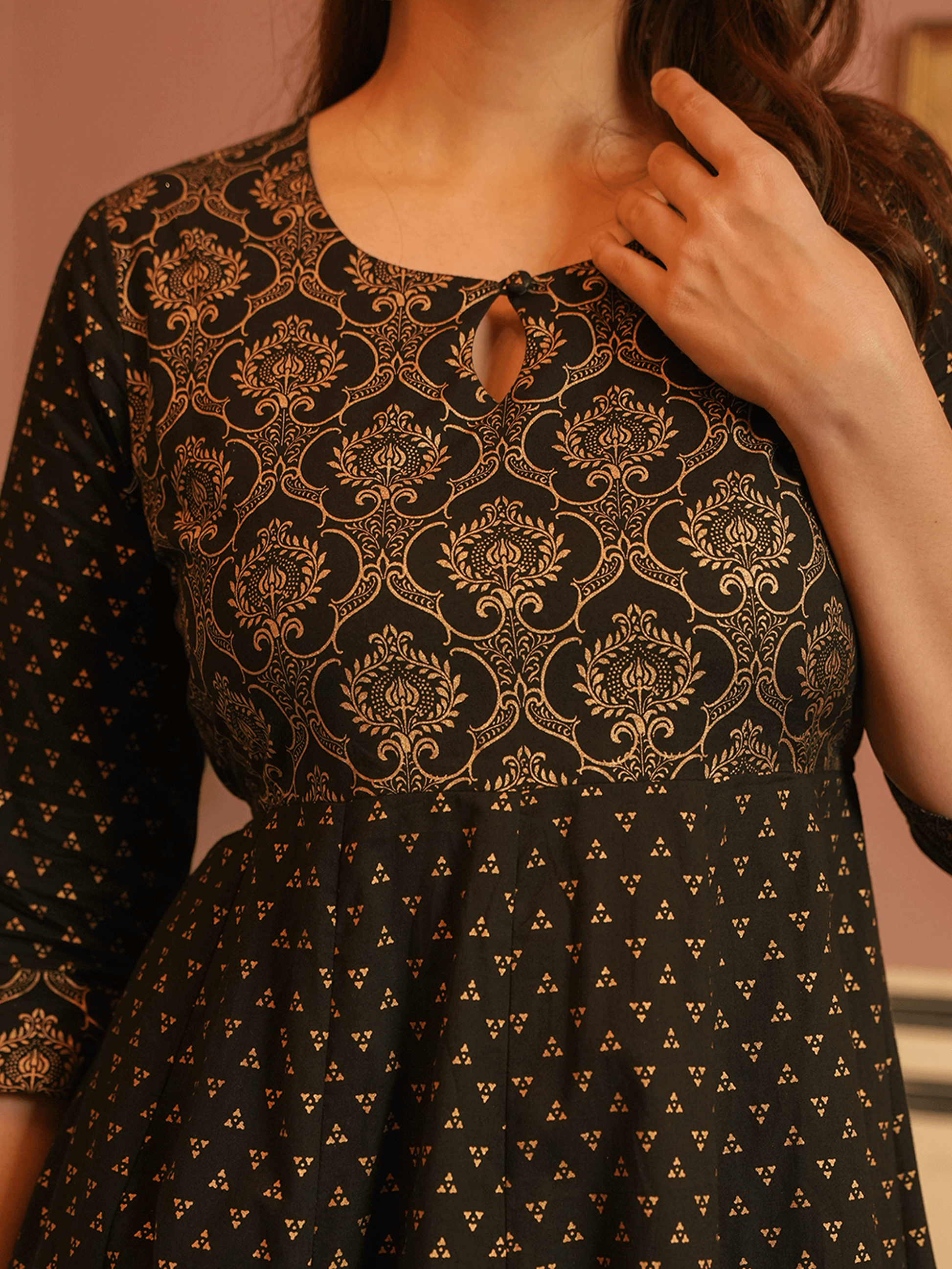 Elevate your ethnic wardrobe with this Soft Cotton kurta in a stunning Black hue. Featuring an elegant Anarkali fit and striking Gold foil accents, it’s perfect for festive celebrations or family gatherings. The Round neckline and 3/4 Sleeve provide all-day comfort. Team with gold-toned accessories for an effortlessly chic vibe. Maintain its charm by following proper care instructions.
