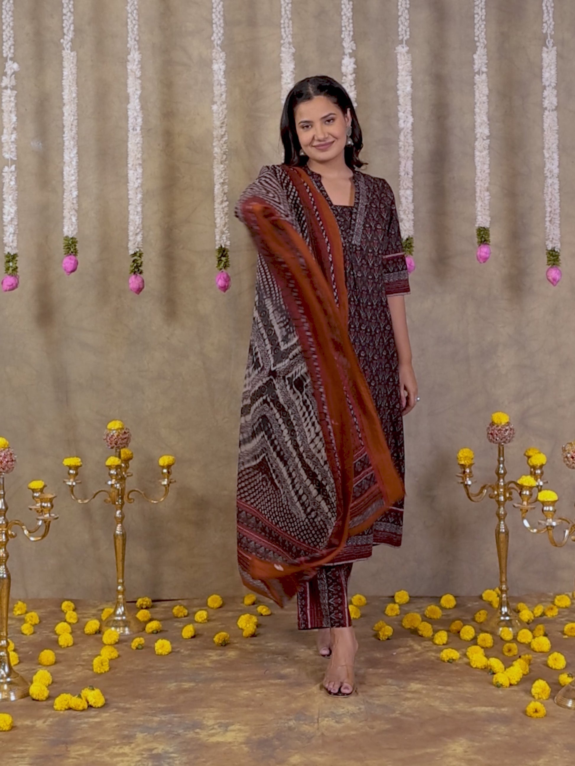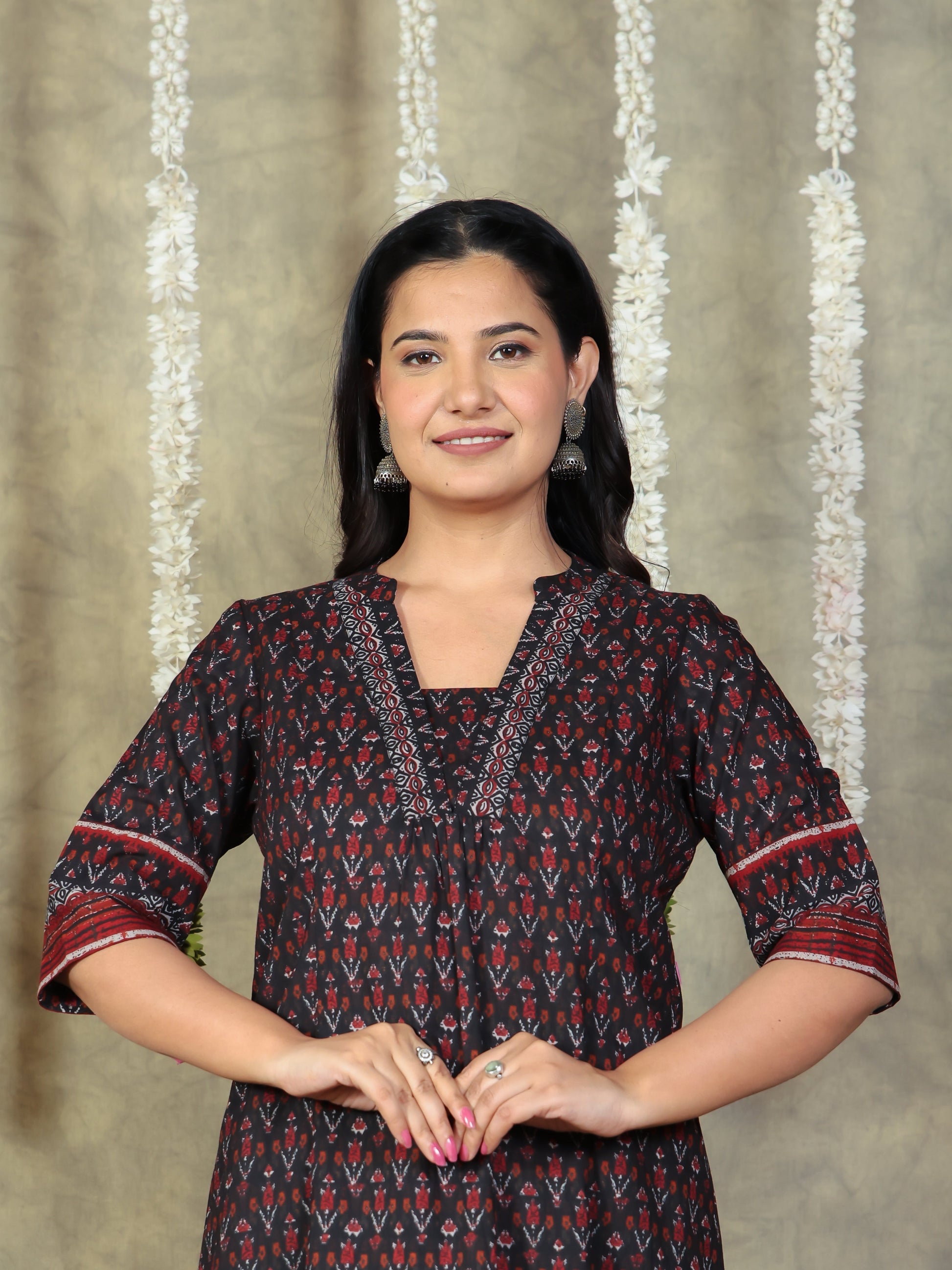 This Black Soft Cotton kurta with a Flared flare is designed for comfort and style. Featuring a V neckline, 3/4 Sleeve sleeves, and a graceful Calf Length hemline, it’s perfect for festive wear or semi-formal gatherings. The Ikat highlights add depth and texture, making it a standout piece. Accessorise with a contrasting dupatta and keep it pristine by following proper care instructions.