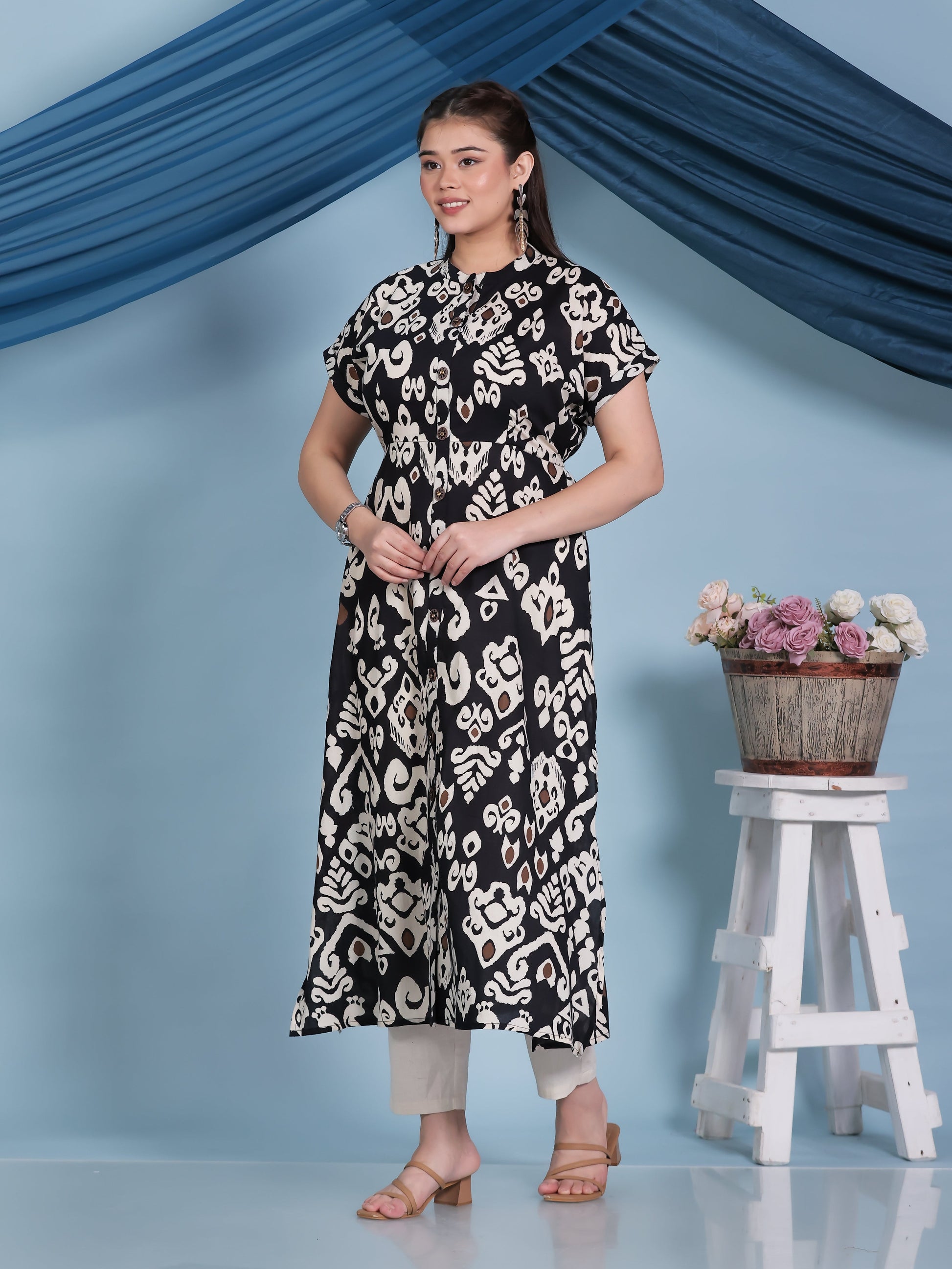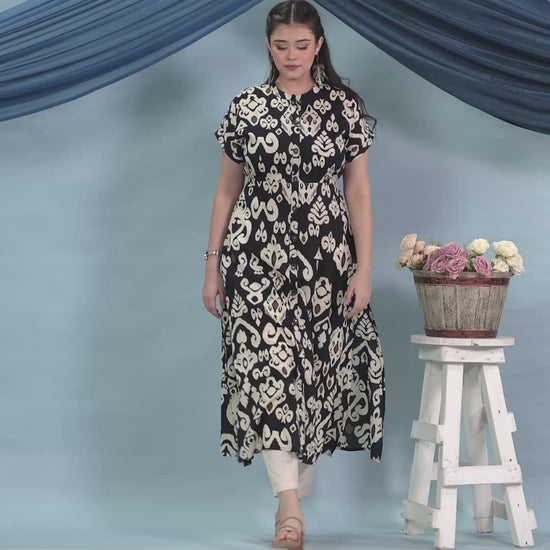 Soft Cotton Ikat A-line Black Kurta