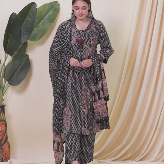 Embroidered Kantha Cotton Paisley Flared Black Kurta