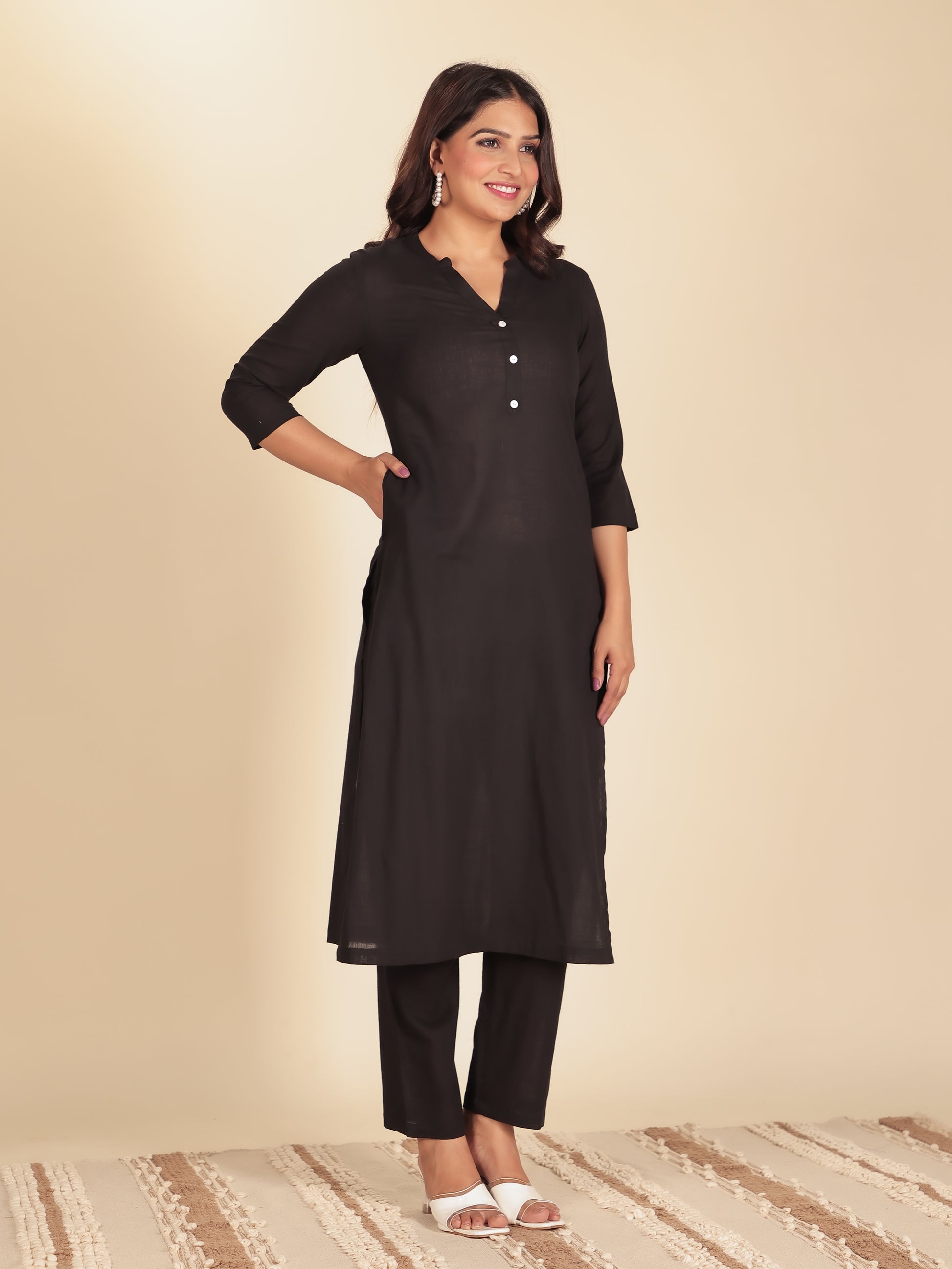 This Black Natural Cotton kurta with a Straight flare is designed for comfort and style. Featuring a Mandarin Collar neckline, 3/4 Sleeves sleeves, and a graceful Calf Length hemline, it’s perfect for festive wear or semi-formal gatherings. The Solid highlights add depth and texture, making it a standout piece. Accessorise with a contrasting dupatta and keep it pristine by following proper care instructions.