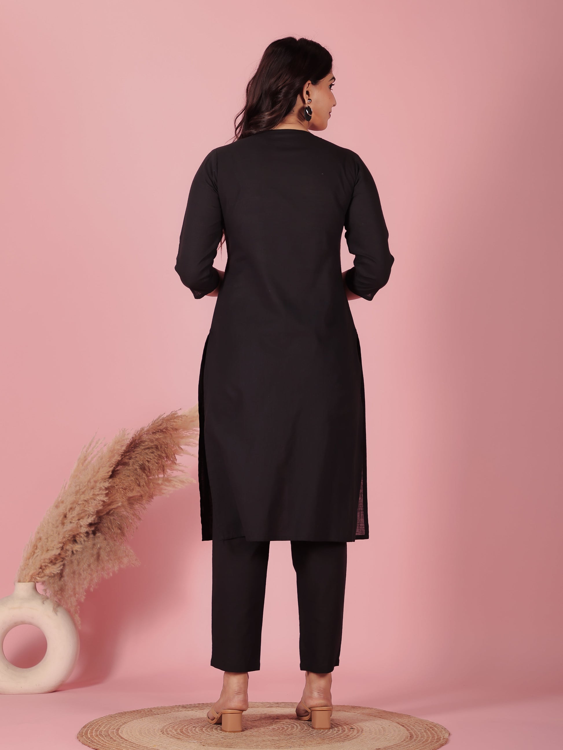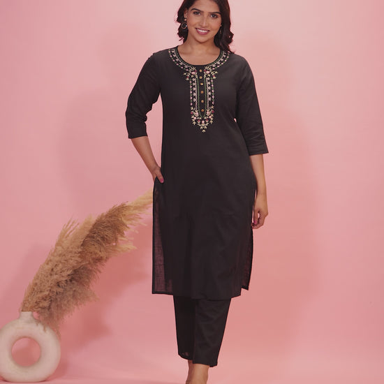 This Black Natural Cotton kurta with a Straight flare is designed for comfort and style. Featuring a Round neckline, 3/4 Sleeve sleeves, and a graceful Calf Length hemline, it’s perfect for festive wear or semi-formal gatherings. The Solid highlights add depth and texture, making it a standout piece. Accessorise with a contrasting dupatta and keep it pristine by following proper care instructions.